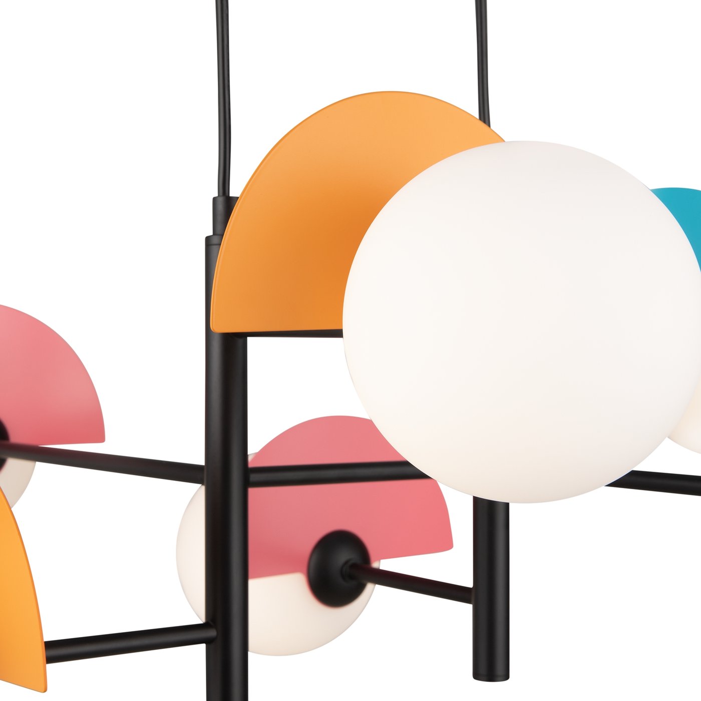 Подвесной светильник с шестью матовыми плафонами из коллекции Sepia от Freya собран на чёрной металлической раме и дополнен декоративными лепестками разных оттенков, создающими динамичную композицию. Сферические стеклянные плафоны распределены по горизонтальной оси, поэтому свет расходится в стороны и вниз, формируя равномерный основной свет в гостиной или столовой. Лампы с цоколем G9 позволяют получить яркое заполняющее освещение при компактных размерах каждого источника, а матовое стекло смягчает поток и убирает жёсткие блики. При размещении над обеденным столом свет перекрывает всю длину поверхности, а разноцветные элементы добавляют визуальный акцент без утяжеления конструкции. Высота подвеса регулируется от 310 мм, что помогает адаптировать модель под конкретную высоту потолка, степень защиты IP20 рассчитана на сухие помещения.