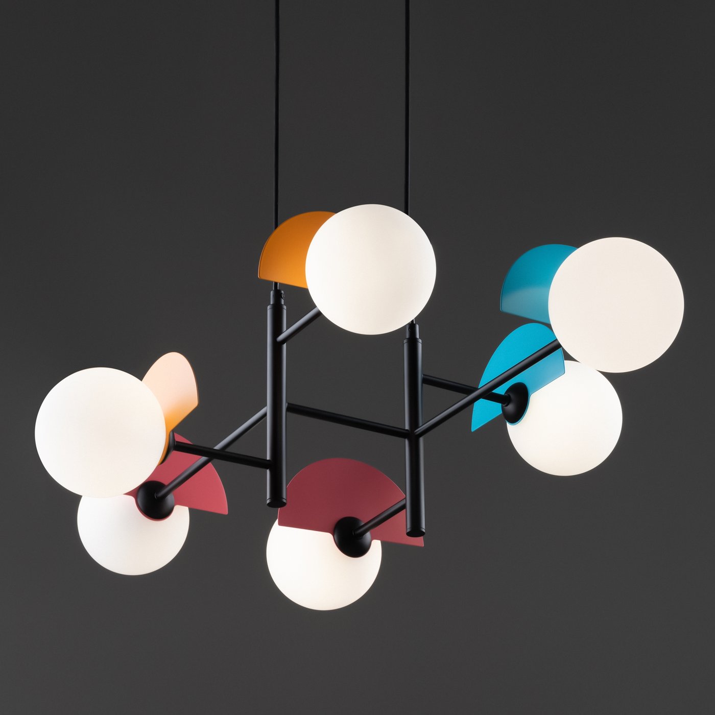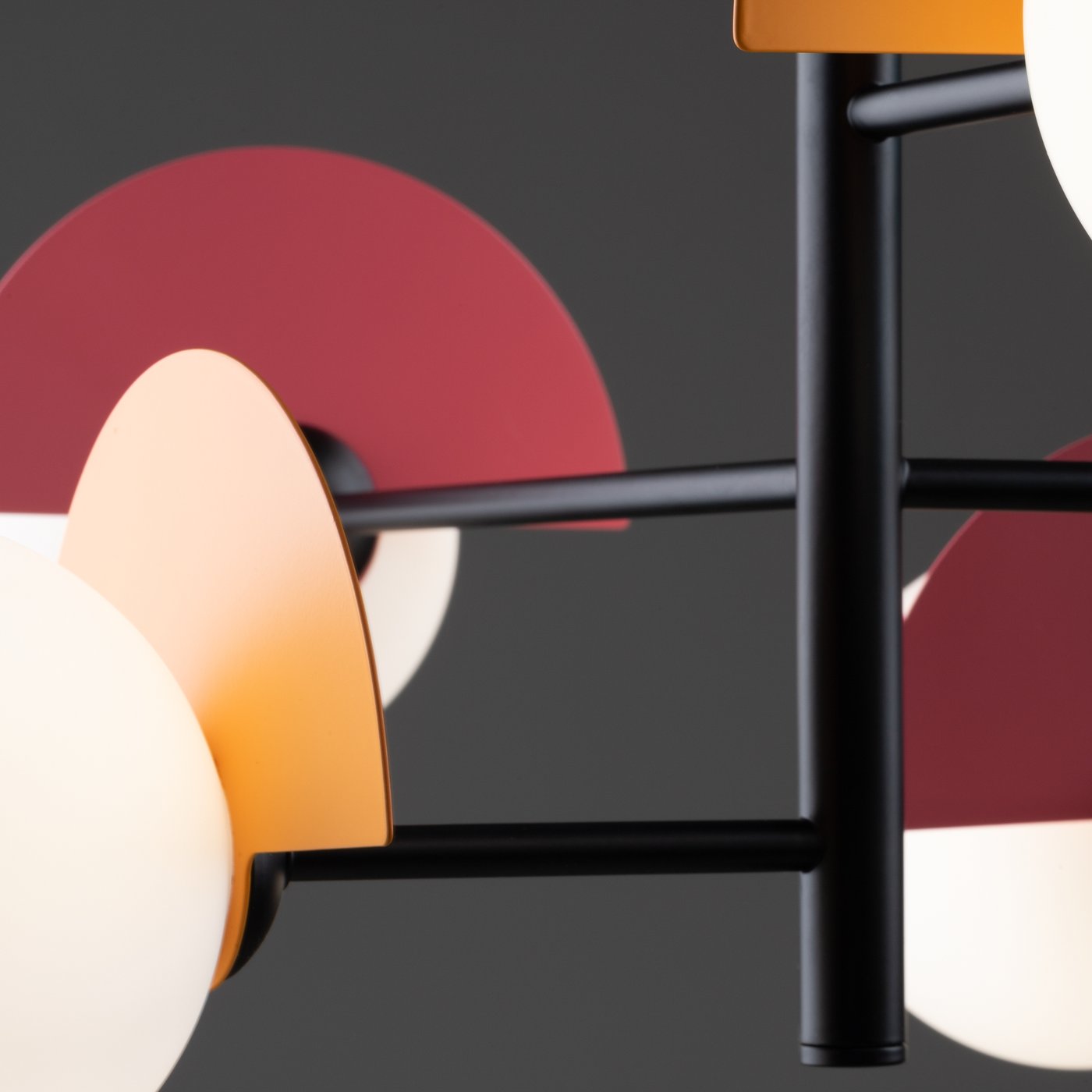 Арматура — металл, цвет — разноцветный или латунь. Белые матовые плафоны из стекла украшены металлическими золотыми или цветными лепестками. Динамичный дизайн для интерьеров в стиле Мемфис. Разнообразие форм в одной конструкции позволяет создать яркое освещение в больших комнатах. Высота регулируется. Источником света служит лампа с цоколем G9.