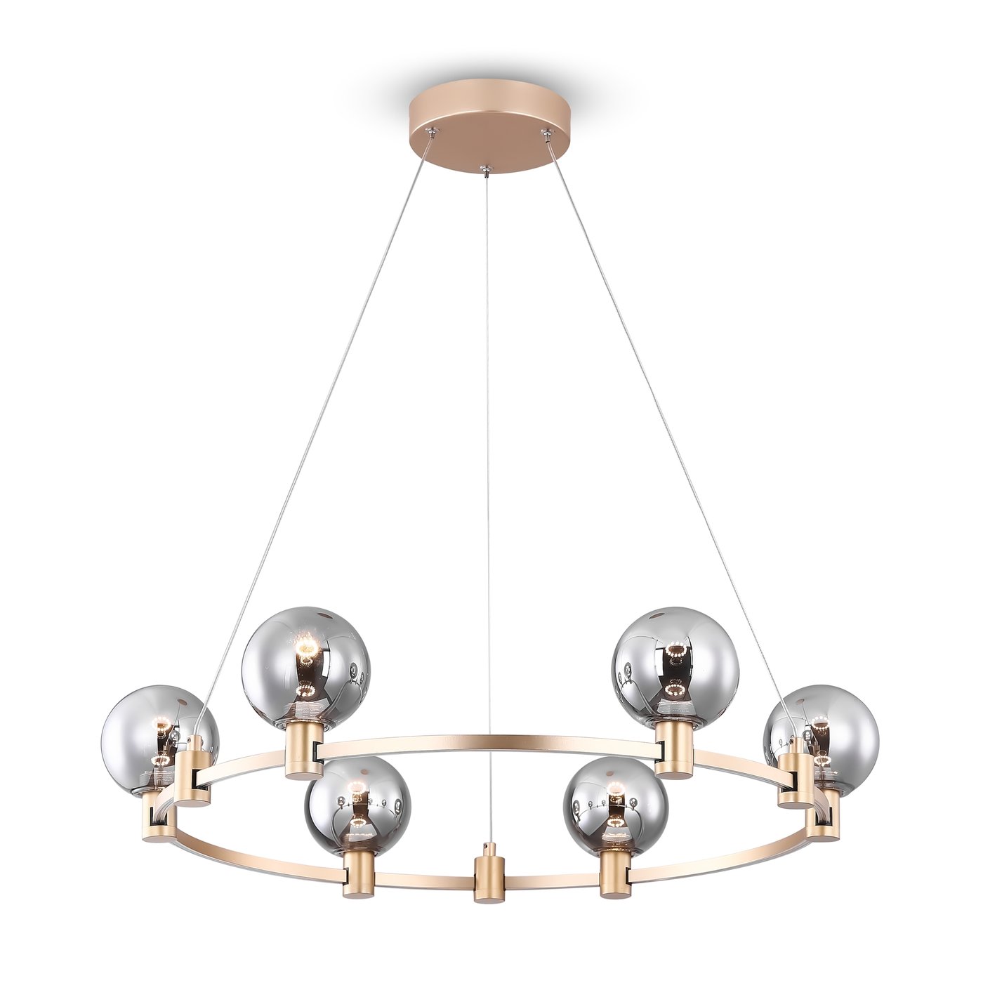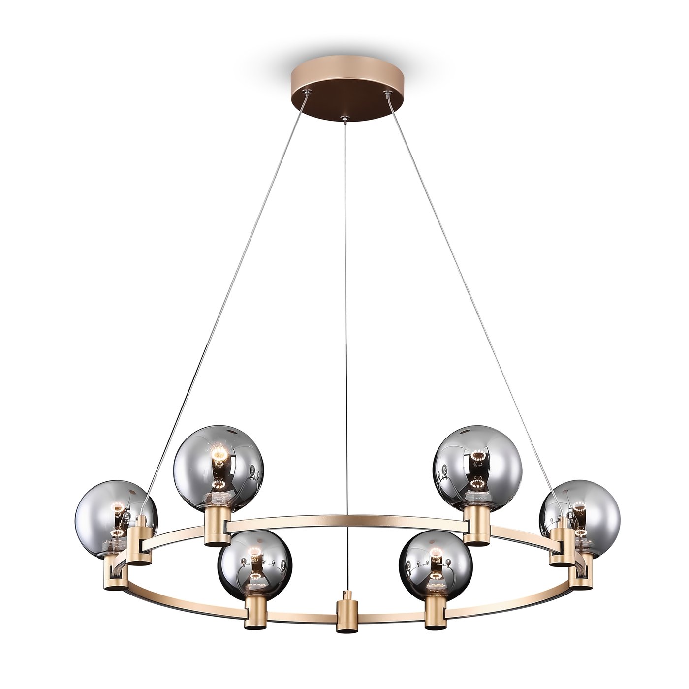 Подвес выполнен в виде тонкого кольца на тросах с равномерно размещёнными сферическими плафонами по окружности, поэтому свет распределяется по периметру и работает на заполнение пространства. В серии Freya Urban золотая арматура подчёркивает геометрию круга, а стеклянные сферы с дымчатым эффектом частично экранируют источники и смягчают прямой свет. Такая модель подходит для основного освещения гостиной или столовой зоны: при включении шесть LED-модулей формируют равномерное световое поле без выраженного центра. Когда человек перемещается по комнате, свет остаётся стабильным, так как угол рассеивания 120° помогает перекрывать тени между плафонами. Световой поток 1400 лм при температуре 3000K даёт тёплую нейтральную картину, комфортную для ежедневного использования. Регулируемая высота подвеса позволяет адаптировать композицию под уровень потолка и точно задать положение относительно стола. Степень защиты IP20 рассчитана на сухие жилые помещения.