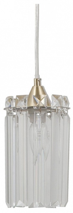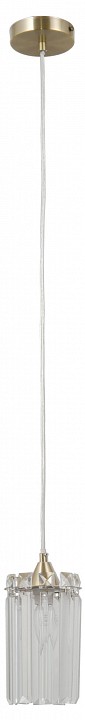 Подвесной светильник фиксируется на потолке с помощью монтажной пластины и состоит из одного прозрачного цилиндрического плафона из хрусталя K9, окружённого металлической глянцевой золотой арматурой. Высота изделия составляет 2230 мм, диаметр плафона 110 мм, свет направлен вниз, источник — лампа накаливания или LED с цоколем E14, максимальная мощность 40 Вт, диммирование отсутствует. Предназначен для жилых и рабочих помещений, таких как гостиная, кабинет и прихожая, рассчитан на эксплуатацию при температуре от +1 до +35 °C, класс электробезопасности I, степень защиты IP20. Материал и прозрачность плафона обеспечивают видимость лампы и распределение света.