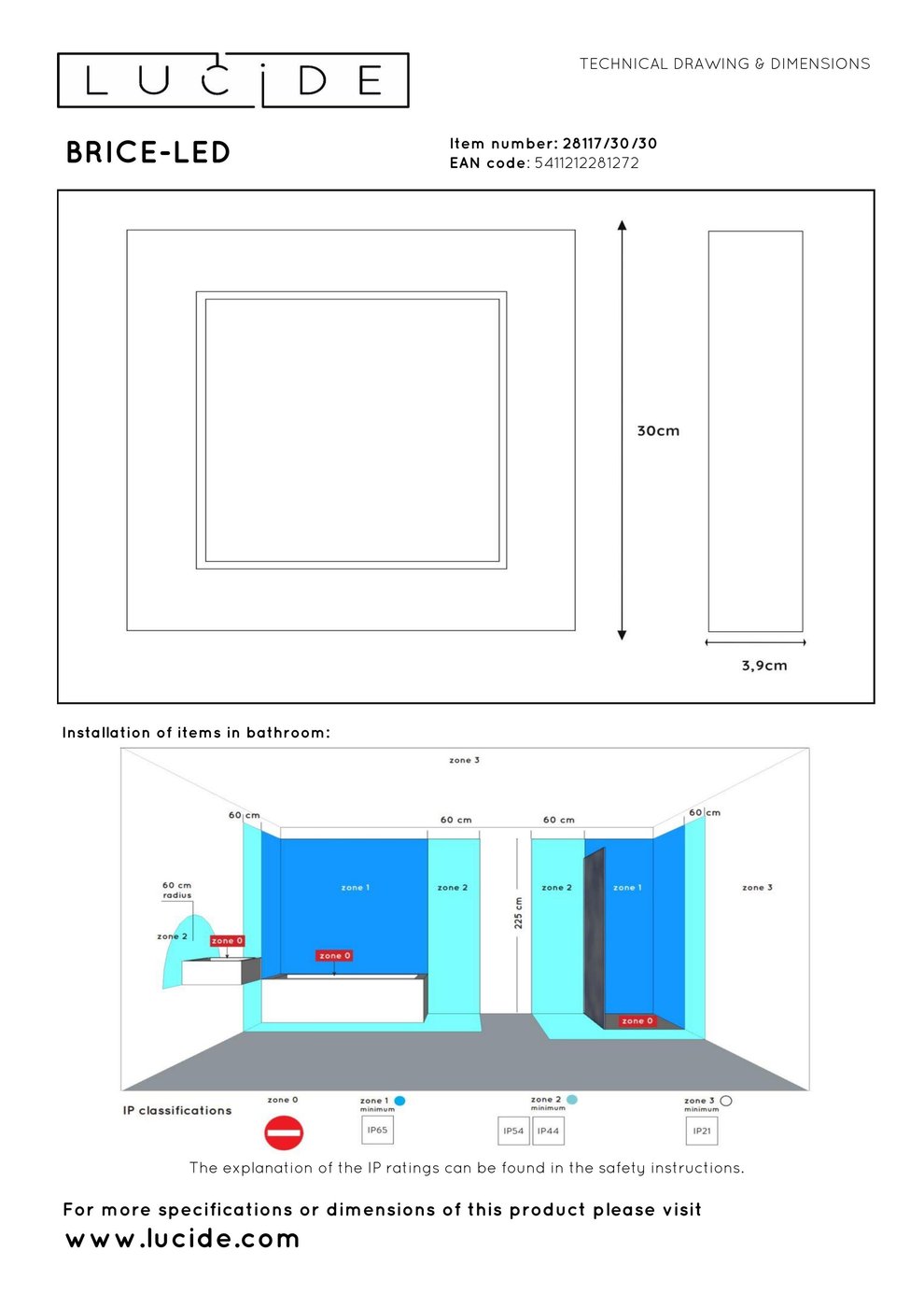 28117/30/30 Lucide Brice потолочный светильник квадратной формы с матовой подсветкой, подходит для ванной