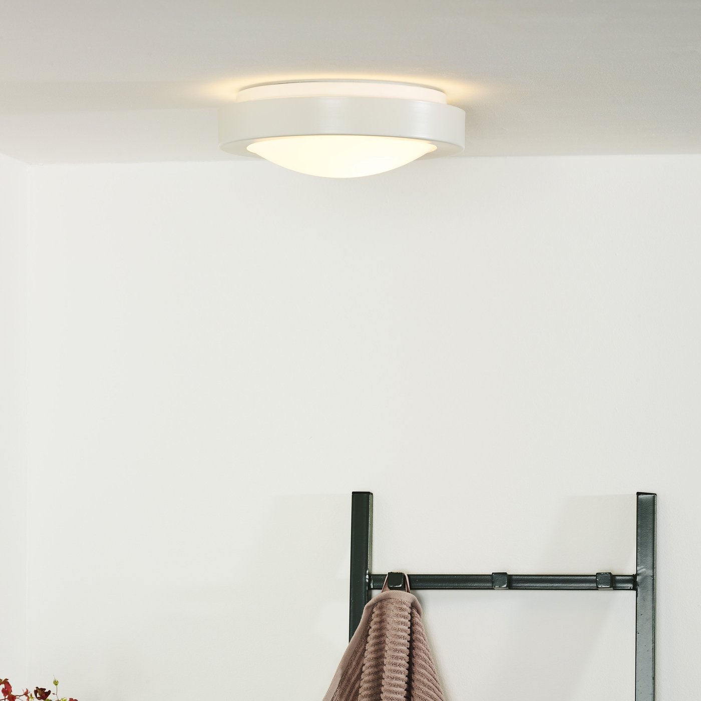 Потолочный светильник предназначен для установки в помещениях с повышенной влажностью, включая ванные комнаты, и выполнен с круглым матовым акриловым плафоном диаметром 27 см и высотой 9 см. Источник света устанавливается в центр плафона, цоколь E27, лампа в комплект не входит, свет распространяется диффузно вокруг корпуса. Корпус светильника обеспечивает защиту IP44 от влаги и брызг, поддерживает использование ламп до 20 Вт и совместим с энергосберегающими моделями. Светильник оснащён возможностью диммирования, управление осуществляется стандартным выключателем, высота монтажа фиксированная, форма корпуса круглая, материал плафона — акрил.