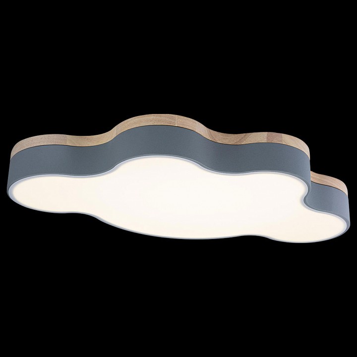 Потолочный светильник с плоским корпусом сложной формы, предназначенный для общего освещения помещений. Конструкция выполнена в виде вытянутого плафона с волнообразным контуром, внутри установлен встроенный светодиодный источник света. Крепление осуществляется на монтажной пластине, что обеспечивает плотное прилегание к потолку при общей высоте всего 70 мм. Габариты составляют 630×350 мм, световой поток 2900 лм при мощности 36 Вт и цветовой температуре 4000K, что даёт нейтральный белый свет. Плафон выполнен из полимера, арматура — из дерева и металла, цветовая схема сочетает белую светящуюся часть и серую внешнюю окантовку с матовой поверхностью.