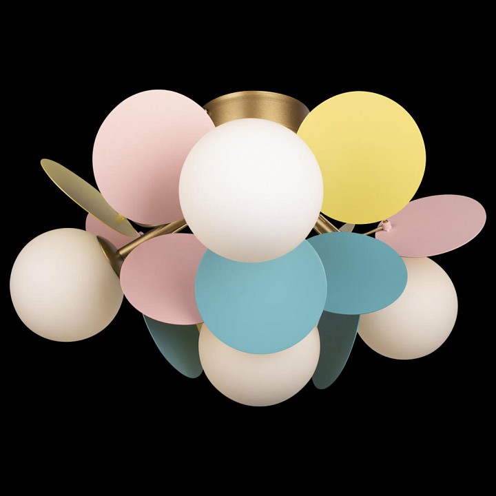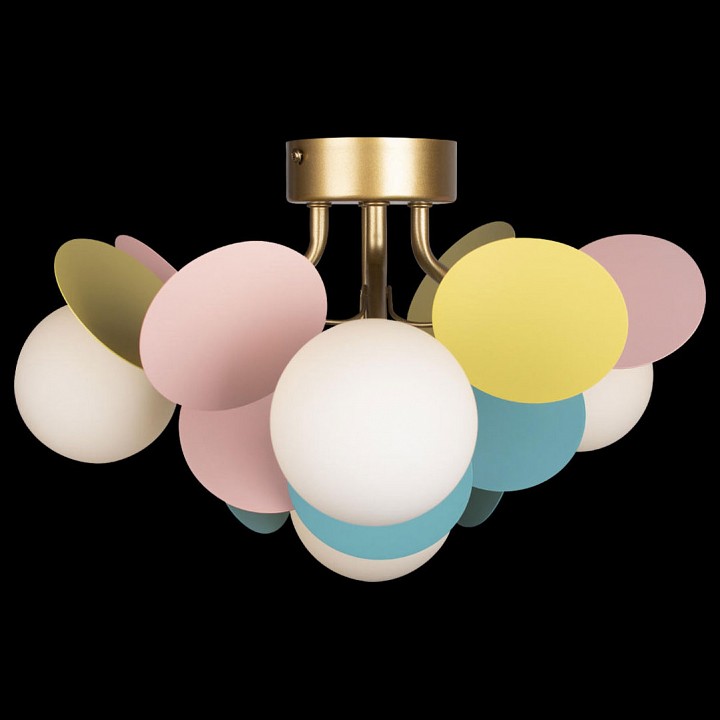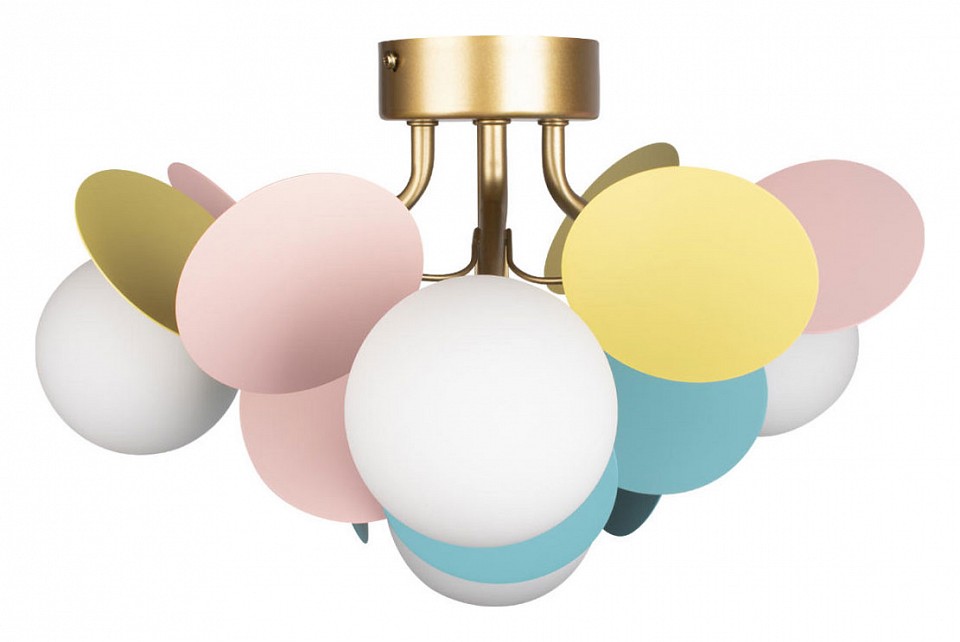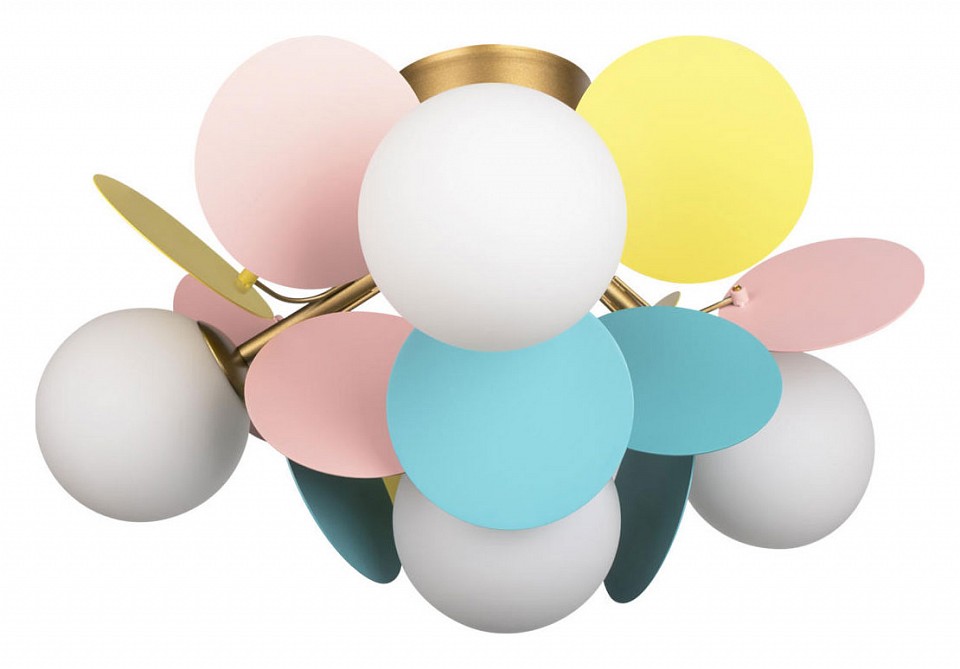 Потолочный светильник с компактной высотой и радиальной композицией предназначен для общего освещения жилых помещений. Конструкция крепится к потолку на монтажной пластине и состоит из центрального узла с короткими держателями, на которых размещены сферические стеклянные плафоны, направленные в стороны и вниз. Вокруг них добавлены плоские декоративные элементы, формирующие объёмную структуру. Используются 4 лампы с цоколем G9 мощностью до 40 Вт каждая, лампы не входят в комплект, предусмотрено диммирование. Диаметр светильника 470 мм при высоте 280 мм, что делает его подходящим для помещений с ограниченной высотой потолка. Цвет плафонов разноцветный, арматура выполнена в золотом цвете.
