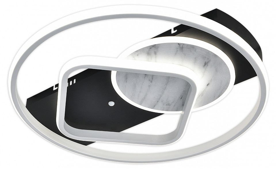 Потолочный светодиодный светильник с комбинированной геометрией, в которой круглая основа дополнена пересекающимся прямоугольным контуром, формирующим несколько светящихся зон. Конструкция крепится вплотную к потолку на монтажной пластине, высота корпуса составляет 65 мм при диаметре 500 мм, что делает модель компактной по вылету. Основание выполнено из металла в черном цвете, рассеиватели — из силикона с матовой поверхностью, обеспечивающей равномерное распределение света. Встроенный LED-модуль мощностью 82 Вт выдает световой поток 6560 лм с регулируемой цветовой температурой в диапазоне 3000–6500 К, поддерживается диммирование. Рассчитан на питание 220 В и использование в сухих помещениях с защитой IP20.