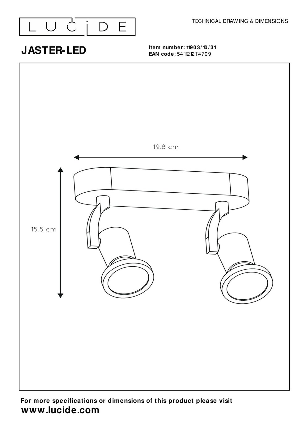 11903/10/31 Lucide Jaster потолочный светильник с двумя регулируемыми спотами белого цвета