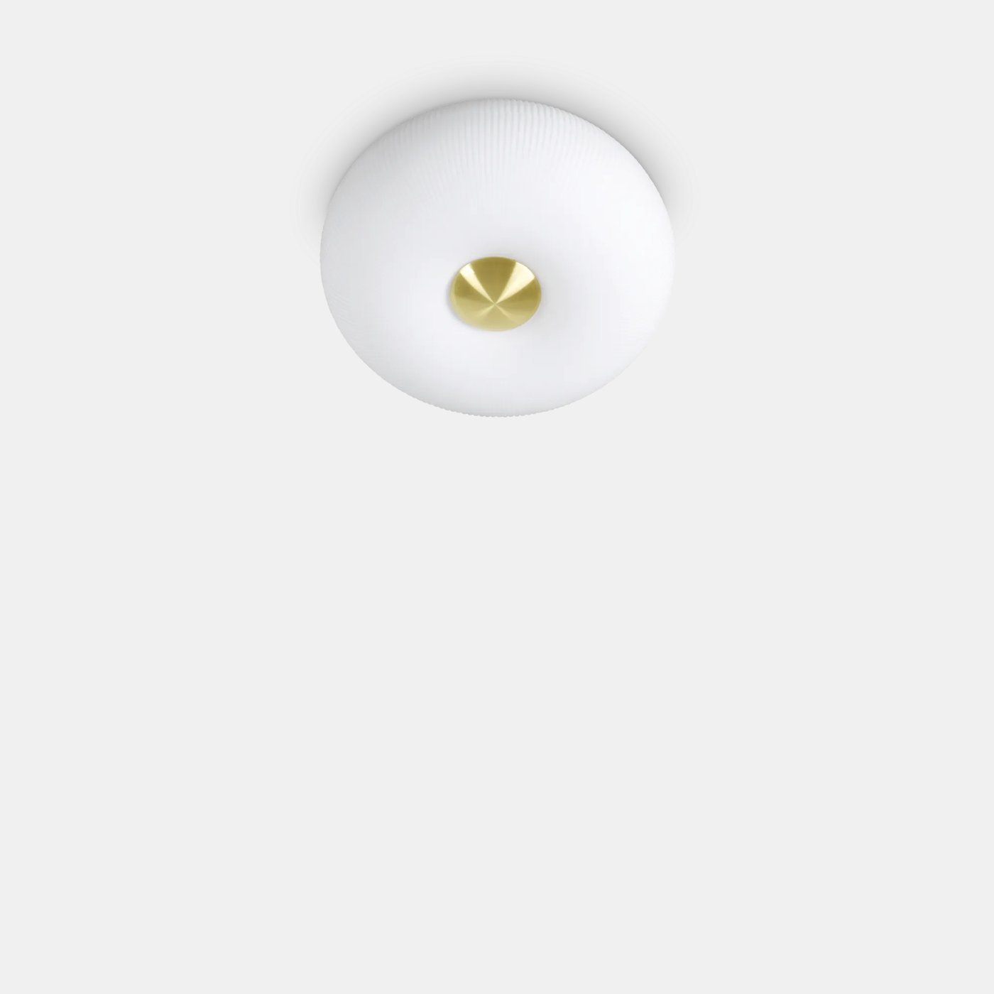 Металлический каркас с отделкой из матовой латуни. Рассеиватель из выдувного белого стекла с травлением и декоративными рельефными полосами.