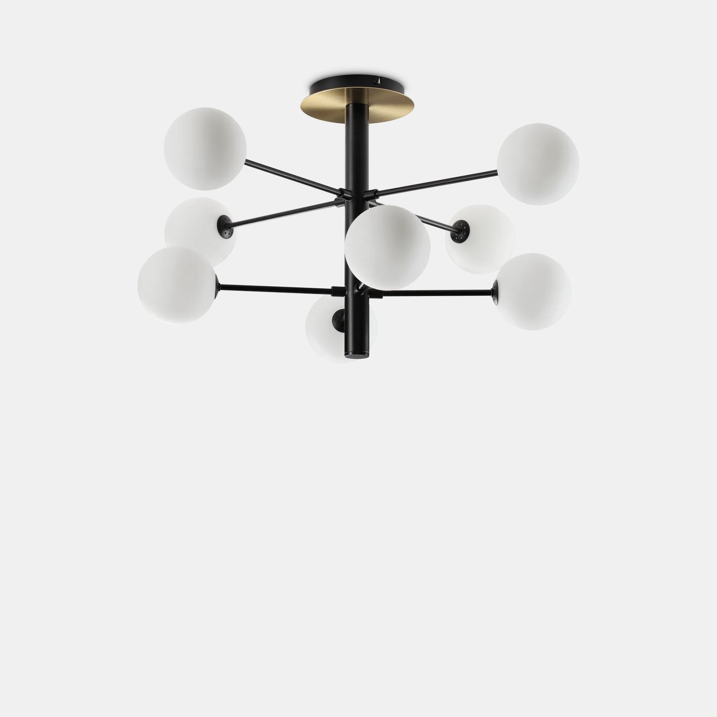 Потолочный светильник COSMOPOLITAN характеризуется высококачественными материалами. Металлический каркас покрыт матовой отделкой, а белые рассеиватели света изготовлены из выдувного стекла с кислотным травлением. Черный цвет с деталями из сатинированной латуни придает светильнику благородный вид.