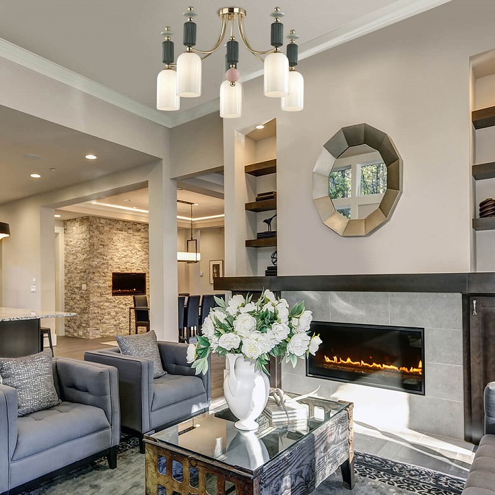 потолочная люстра с пятью абажурами разных оттенков