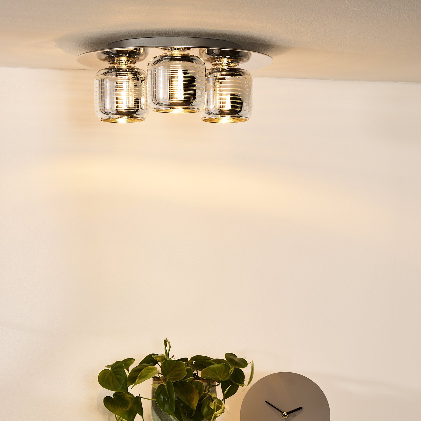 Блестящая тарелка с тремя подсвечивающимися цилиндрами. Блестящая хромированная отделка придает потолочному светильнику Eryn классический вид. Светильник из высококачественного металла крепится к потолку полузаметно и легко подключается к настенному выключателю. Вы можете полностью контролировать его, подключив диммер. Три источника света аккуратно распределяют свет вниз. Рифленые края цилиндров создают атмосферное свечение сверху.
