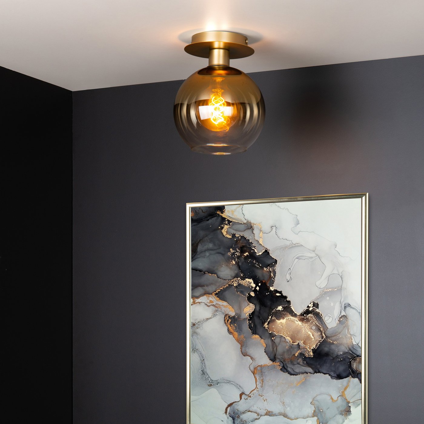 Потолочный светильник с компактным накладным креплением предназначен для общего освещения небольших помещений и устанавливается вплотную к потолку. Конструкция включает металлическую основу с золотистой отделкой и стеклянный плафон сферической формы диаметром около 20 см из дымчатого стекла, через которое виден источник света. Используется одна лампа с цоколем E27 мощностью до 60 Вт, при этом лампа в комплект не входит. Свет распространяется во все стороны через полупрозрачный плафон. Общая высота светильника составляет около 24,5 см. Подключение к сети 230 В, степень защиты IP20, допускается использование внешнего диммера.