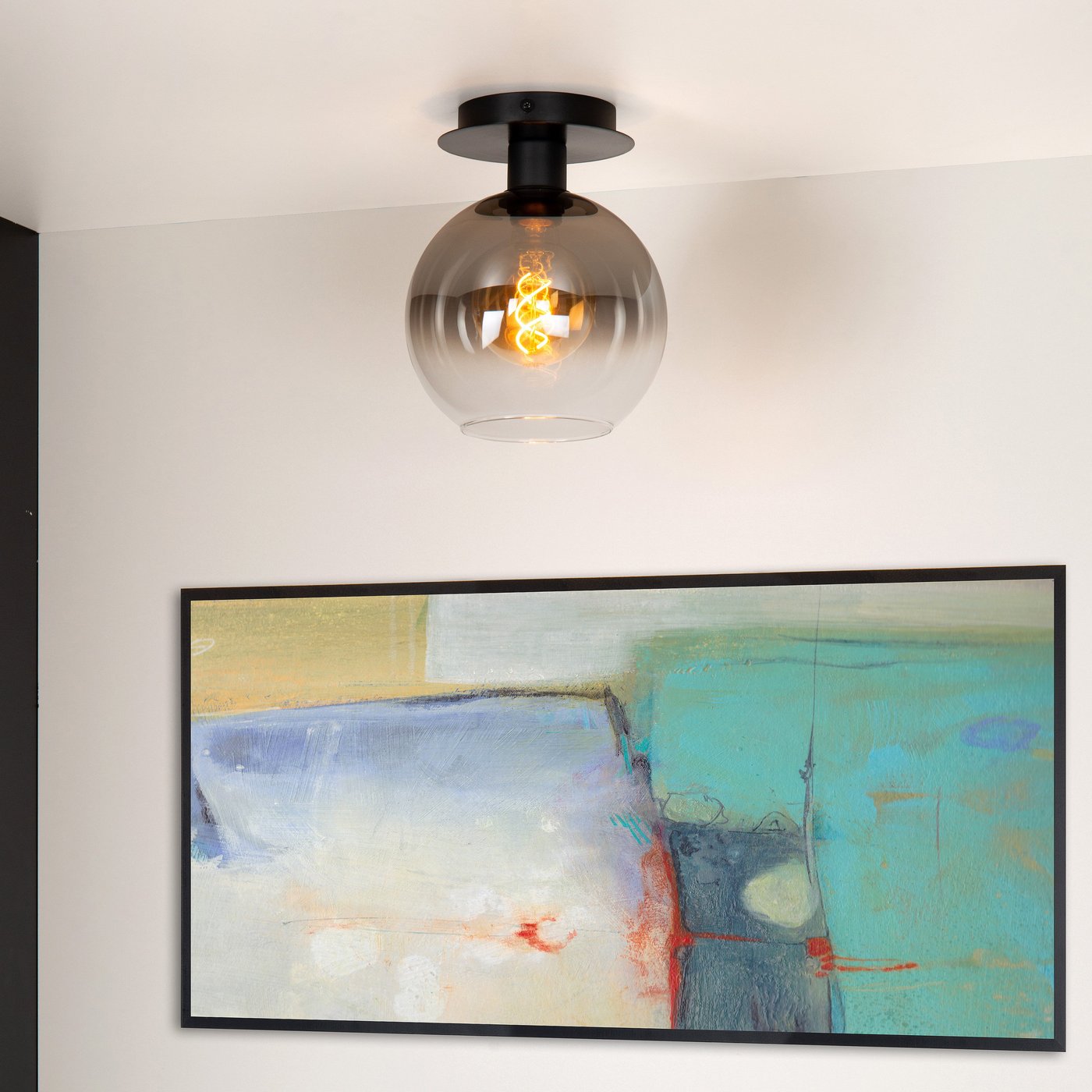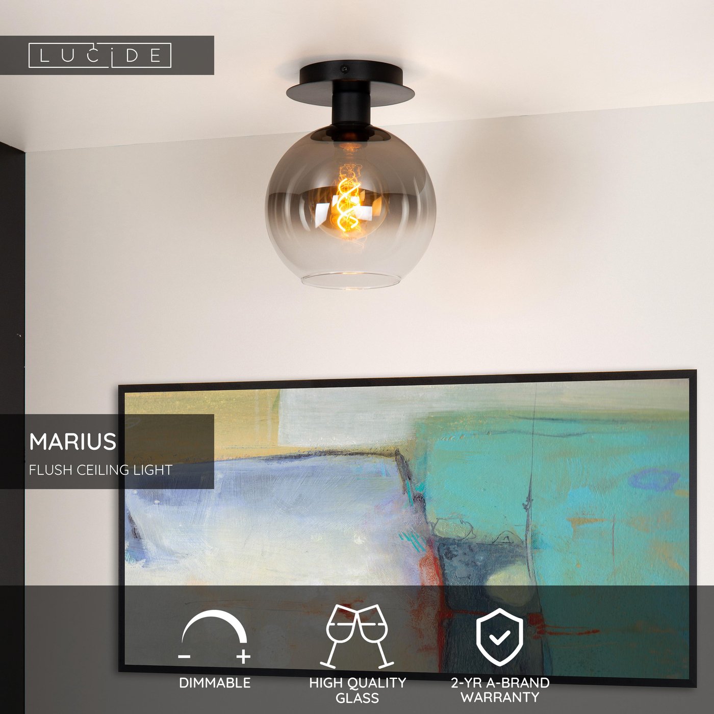 Потолочный светильник из коллекции Marius от Lucide выполнен в компактном накладном формате с круглым основанием и шарообразным плафоном из дымчатого стекла, через который полностью просматривается установленная лампа. Конструкция рассчитана на одну лампу с цоколем E27 мощностью до 60 Вт, при этом свет распространяется во все стороны за счёт прозрачного стекла. Габариты составляют 20×20×24,5 см, что делает модель подходящей для установки в помещениях с ограниченной высотой потолка. Подключается к сети 230 В, поддерживает диммирование при использовании внешнего диммера, степень защиты IP20. Артикул 74114/01/30.