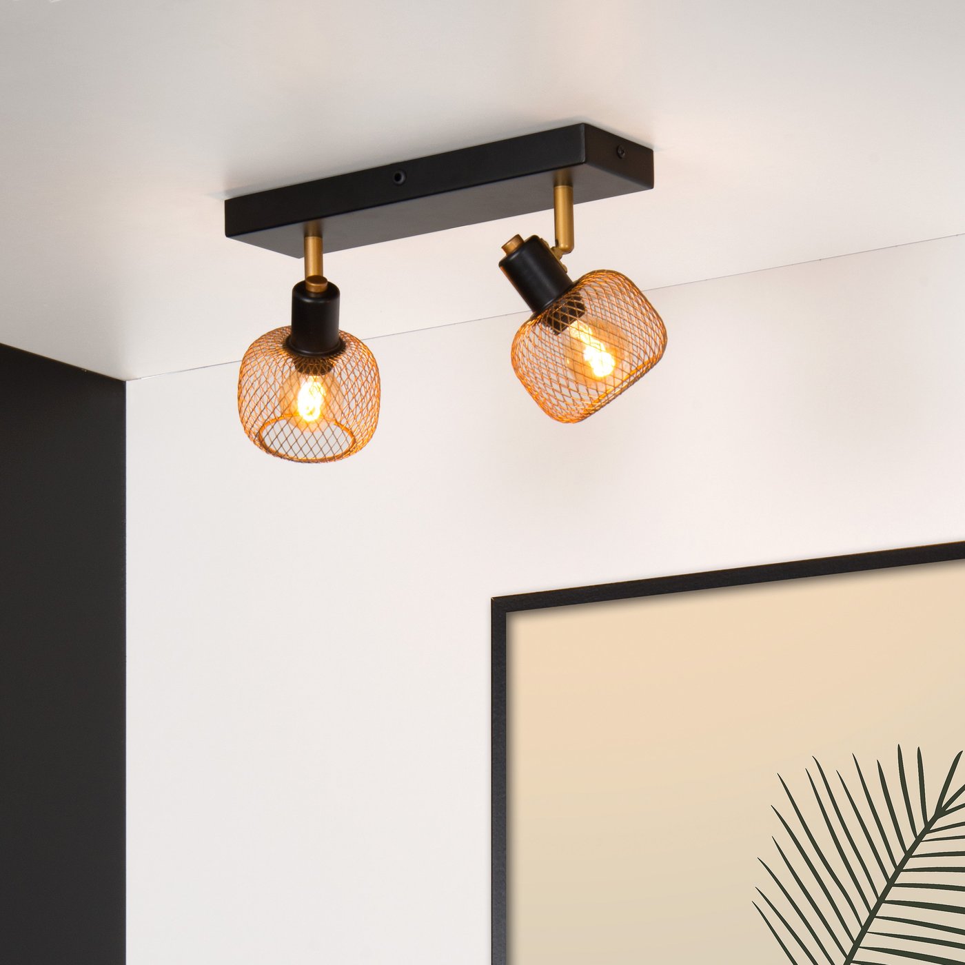 Потолочный светильник с двумя поворотными источниками света предназначен для направленного освещения и крепится на прямоугольное основание длиной около 31 см. Конструкция включает два цилиндрических держателя с бронзовым оттенком, на которых закреплены металлические плафоны в виде сетчатых сфер диаметром около 10 см, обеспечивающих частично открытое распределение света. Каждый световой модуль может поворачиваться и наклоняться, включая вращение до 360°, что позволяет точно направлять поток. Используются лампы с цоколем E14 мощностью до 25 Вт, лампы в комплект не входят. Общая высота составляет 14 см, корпус выполнен из металла, степень защиты IP20 рассчитана на использование внутри помещений.