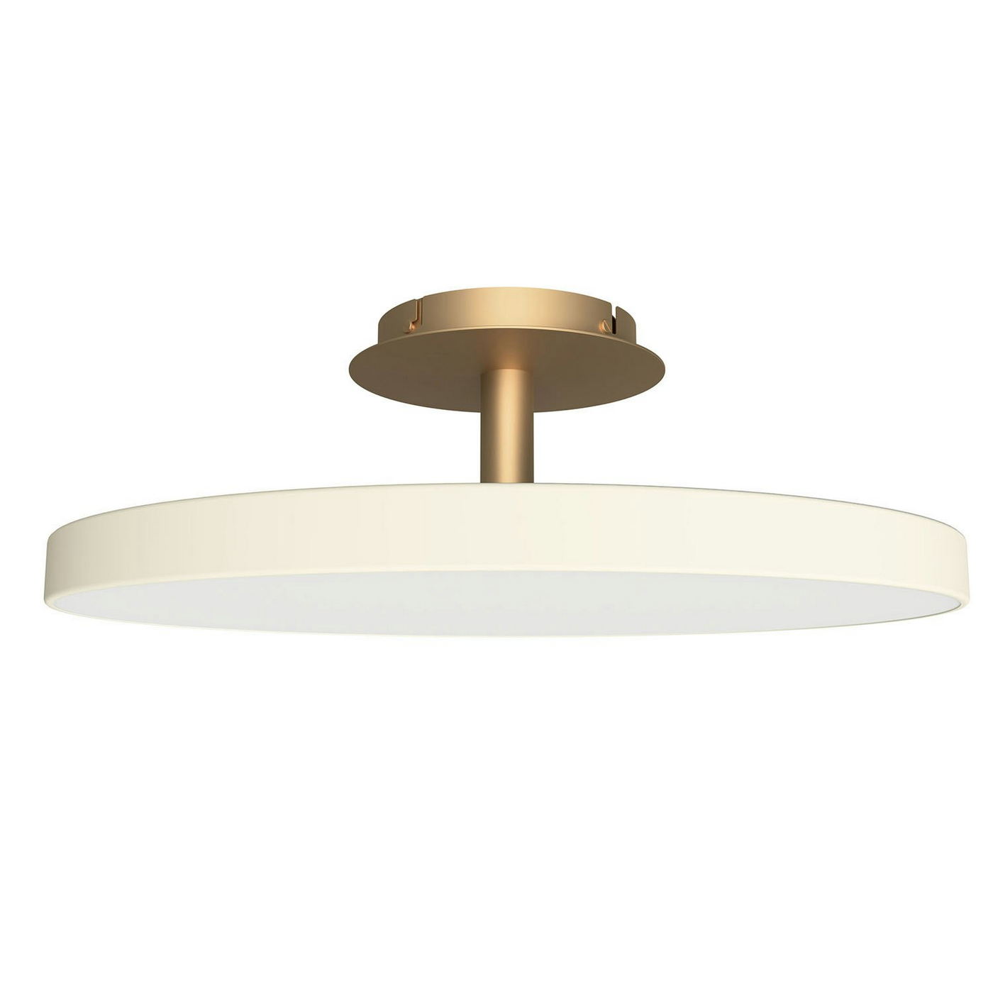 Потолочный светильник с плоским круглым плафоном, закреплённым на короткой центральной штанге от потолочного основания, предназначенный для общего освещения с распределением света вверх и вниз. Конструкция включает тонкий диск с рассеивателем и встроенным светодиодным модулем, скрытым внутри корпуса. Модель Asteria Up от Umage, артикул 2329, выполнена в жемчужно-белом цвете и оснащена встроенным LED мощностью 37 Вт с цветовой температурой 3000K и световым потоком 2300 лм. Диаметр плафона составляет 600 мм при общей высоте около 210 мм. Поддерживается диммирование, степень защиты IP20 рассчитана на использование в жилых помещениях.