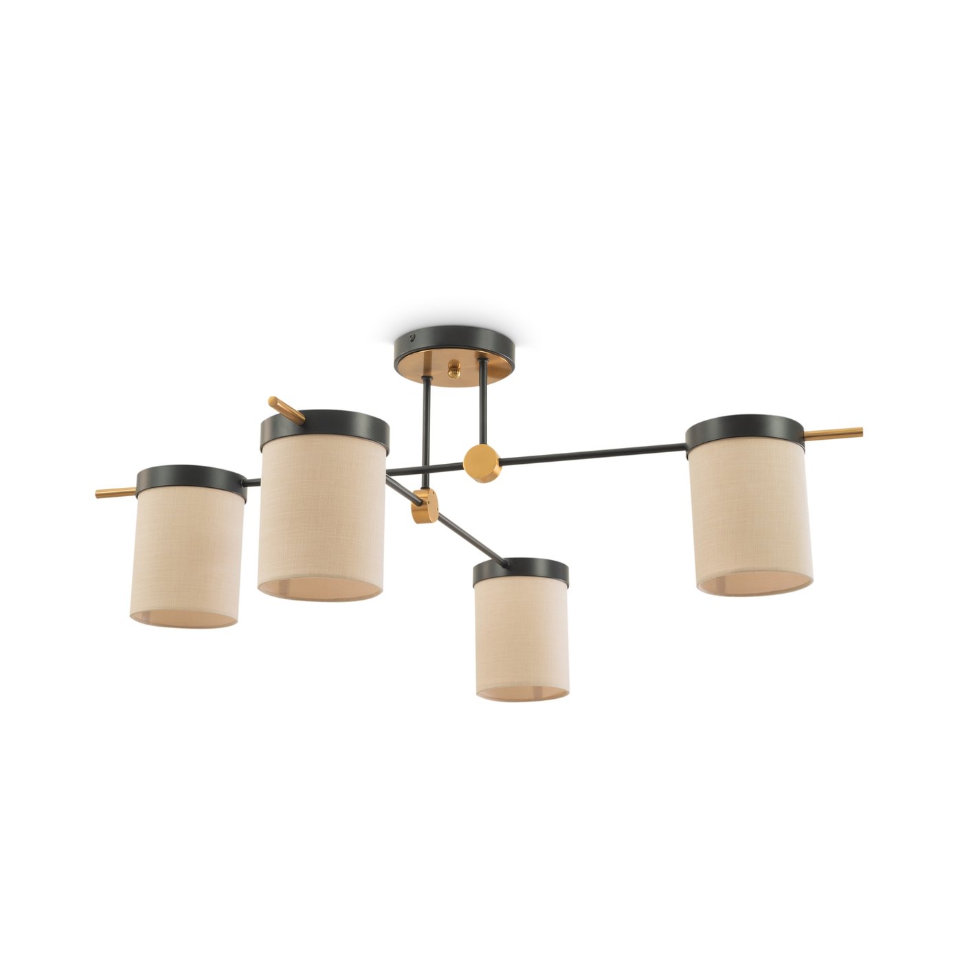 Потолочный светильник с четырьмя тканевыми абажурами, расположенными на разнесённых металлических штангах, формирует равномерный основной свет без излишней высоты конструкции. В серии Freya Bogy чёрная арматура с латунными акцентами работает как жёсткий каркас, а бежевые цилиндрические плафоны смягчают поток и распределяют его по комнате. Когда человек перемещается по гостиной или спальне, свет раскрывается сразу в нескольких направлениях и уменьшает контраст между центром и углами помещения. Четыре патрона E14 позволяют подобрать лампы нужной яркости и температуры, регулируя интенсивность освещения в зависимости от площади и высоты потолка. Высота плафонов 150 мм и компактная потолочная чаша 25 мм делают модель уместной для помещений с невысокими перекрытиями, где важно сохранить пространство по вертикали. Степень защиты IP20 рассчитана на сухие жилые комнаты, а тканевые абажуры создают мягкое рассеивание без резких теней на стенах и потолке.
