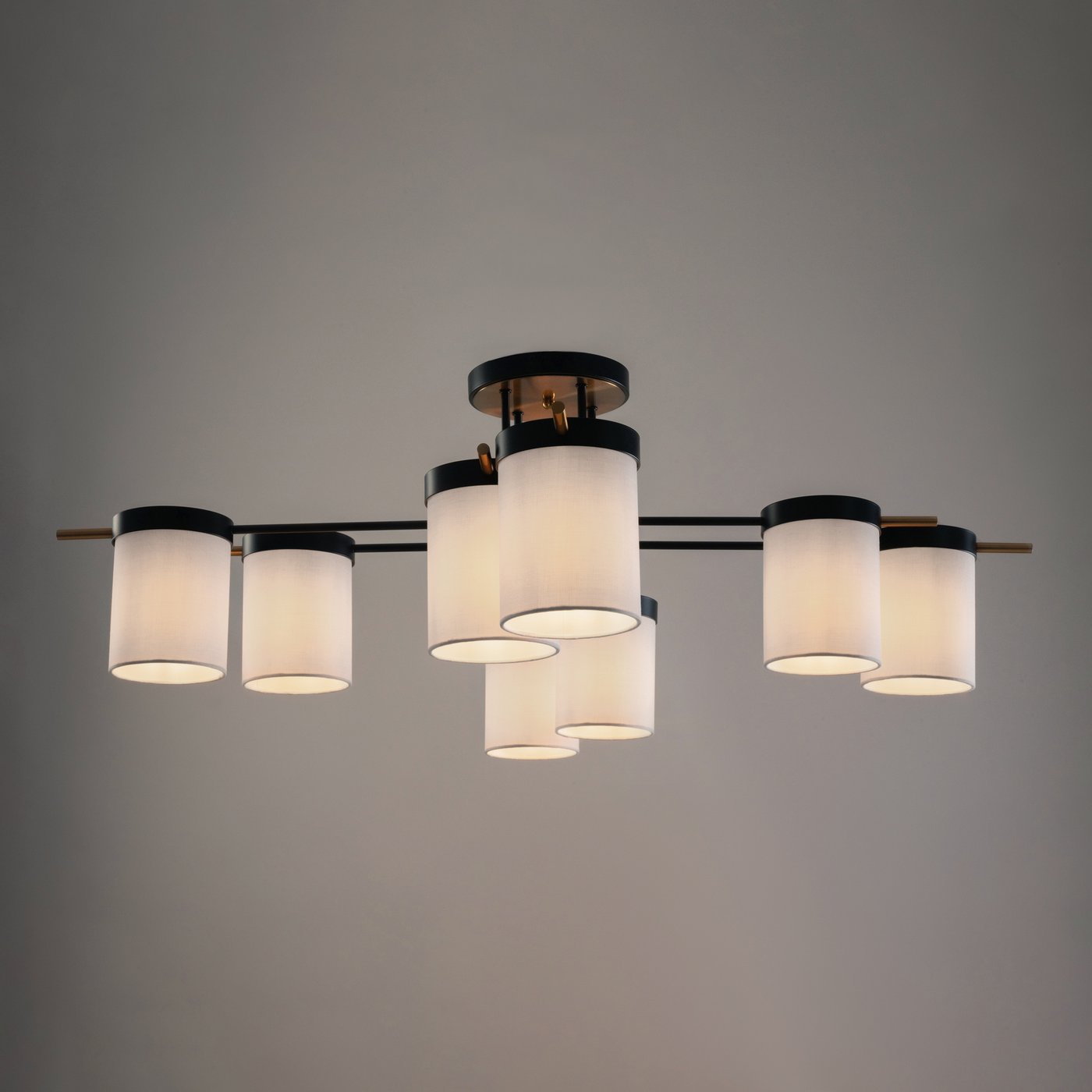 Потолочный светильник Freya из коллекции Bogy выполнен в виде компактной многорожковой конструкции с восемью цилиндрическими тканевыми абажурами на металлической основе чёрного цвета с латунными акцентами. Низкая высота потолочной чаши позволяет использовать модель в помещениях с невысокими потолками, где важно сохранить ощущение пространства без подвесных элементов. Абажуры высотой 150 мм мягко рассеивают свет во все стороны, формируя равномерный основной свет без жёстких теней, поэтому в гостиной или спальне освещение распределяется по всей площади комнаты. Цоколь E14 даёт возможность подобрать лампы нужной мощности и температуры, регулируя яркость под конкретный сценарий — от спокойного вечернего до более интенсивного повседневного. Ткань смягчает поток и делает его визуально тёплым, а металлическая арматура обеспечивает устойчивость и чёткую геометрию композиции. Степень защиты IP20 ориентирует модель на сухие жилые интерьеры, где требуется комфортное рассеянное освещение.