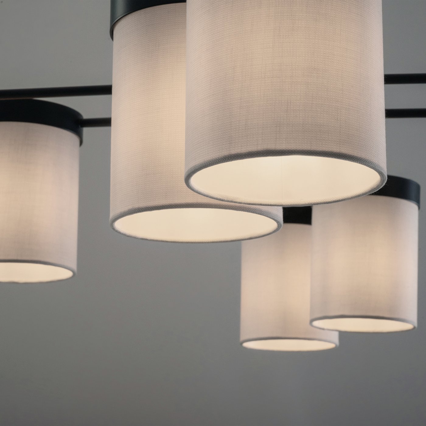 Арматура из металла. Основной цвет — чёрный, декоративные элементы в цвете латунь. Тканевые бежевые абажуры-цилиндры украшены чёрными металлическими основаниями. Компактные размеры для невысоких потолков. Источник света — лампа с цоколем Е14.