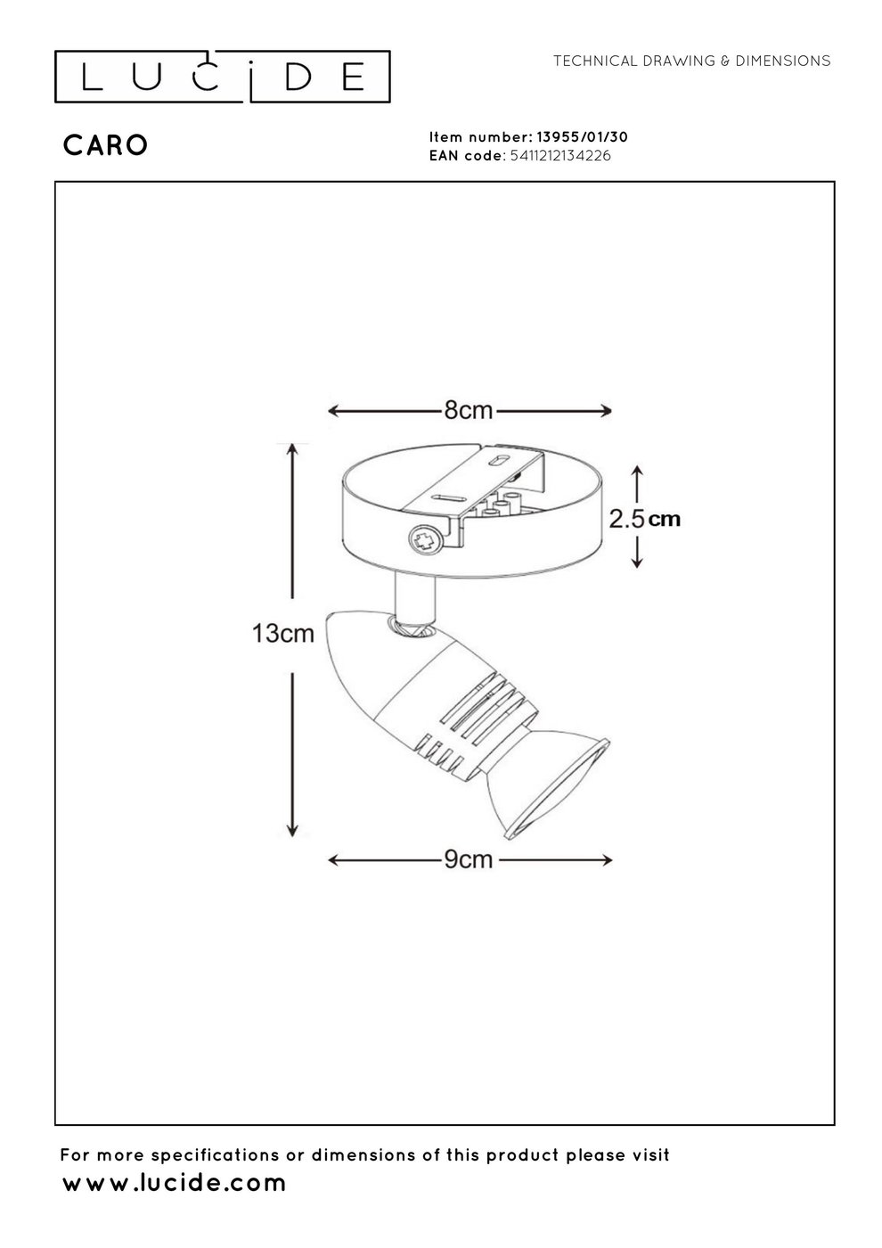 13955/01/30 Lucide Caro потолочный светильник с одним направленным плафоном на короткой штанге