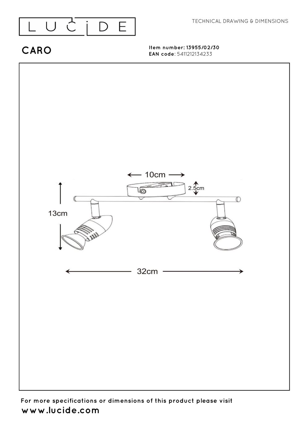 Потолочный спот Lucide Caro с артикулом 13955/02/30 рассчитан на направленное освещение за счёт двух регулируемых источников света, закреплённых на горизонтальной штанге с центральным основанием. Каждый световой модуль выполнен в виде цилиндрического плафона и может поворачиваться и наклоняться, включая полный оборот, что позволяет точно задавать направление светового потока вниз. Конструкция металлическая, компактная: общие размеры 32×9×13 см, потолочная чаша 10×10×2,5 см. Используются лампы с цоколем GU10 мощностью до 5 Вт, лампы не входят в комплект. Поддерживается диммирование, степень защиты IP20, питание от сети 230 В.