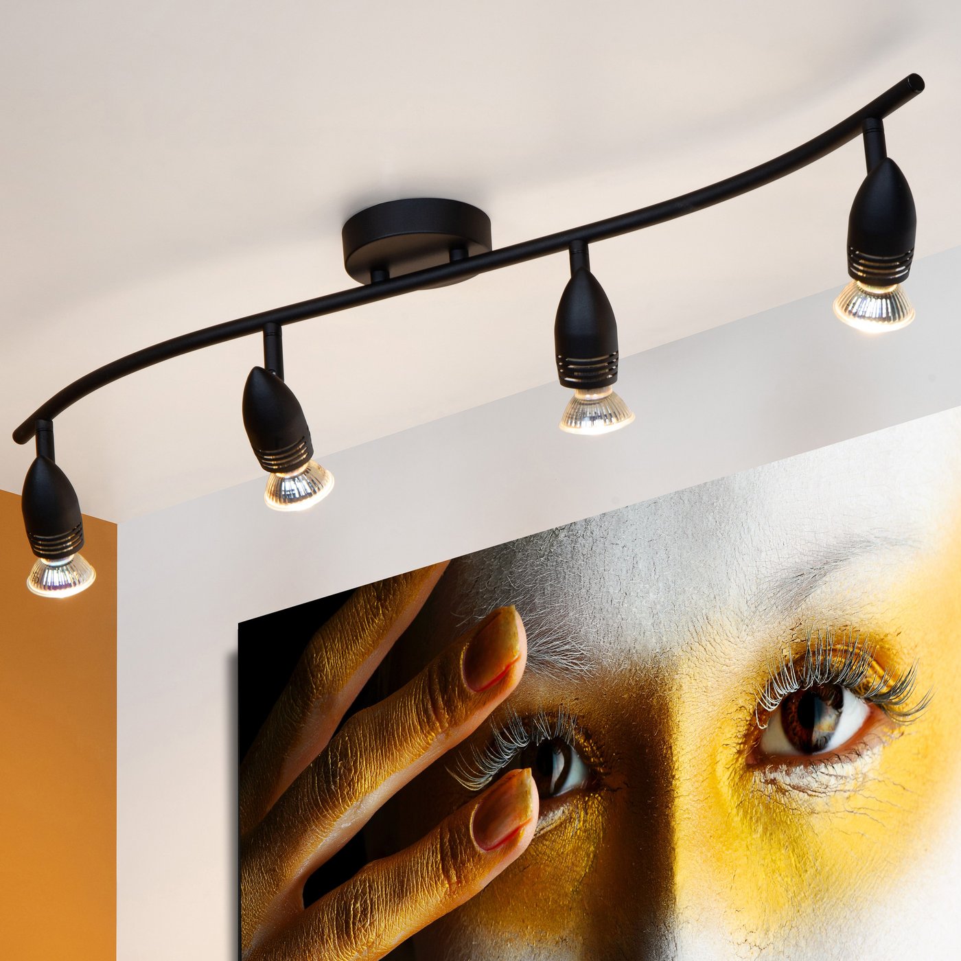Потолочный светильник представляет собой продольную металлическую рейку с четырьмя поворотными и наклонными источниками света с цоколем GU10, каждый рассчитан на лампу мощностью до 5 Вт. Лампы в комплект не входят, но предусмотрена возможность диммирования через выключатель. Конструкция рассчитана на питание 230 В и обеспечивает направленное вниз (даунлайт) освещение. Светильник имеет органическую форму плафонов и металлический каркас, размеры 76×9×13 см, степень защиты IP20, а общая масса 0,8 кг позволяет компактно закрепить его на потолке. Регулировка угла наклона каждой лампы обеспечивает точное направление света для функционального и декоративного применения в интерьерах.