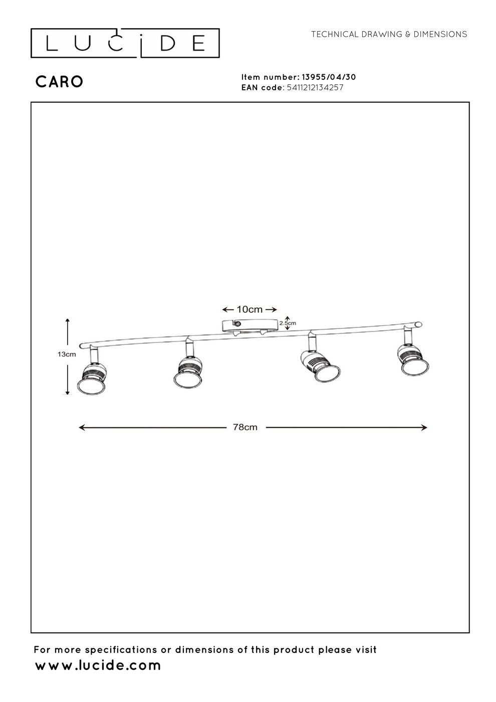 13955/04/30 Lucide Caro потолочный светильник с шестью регулируемыми источниками света на продольной рейке
