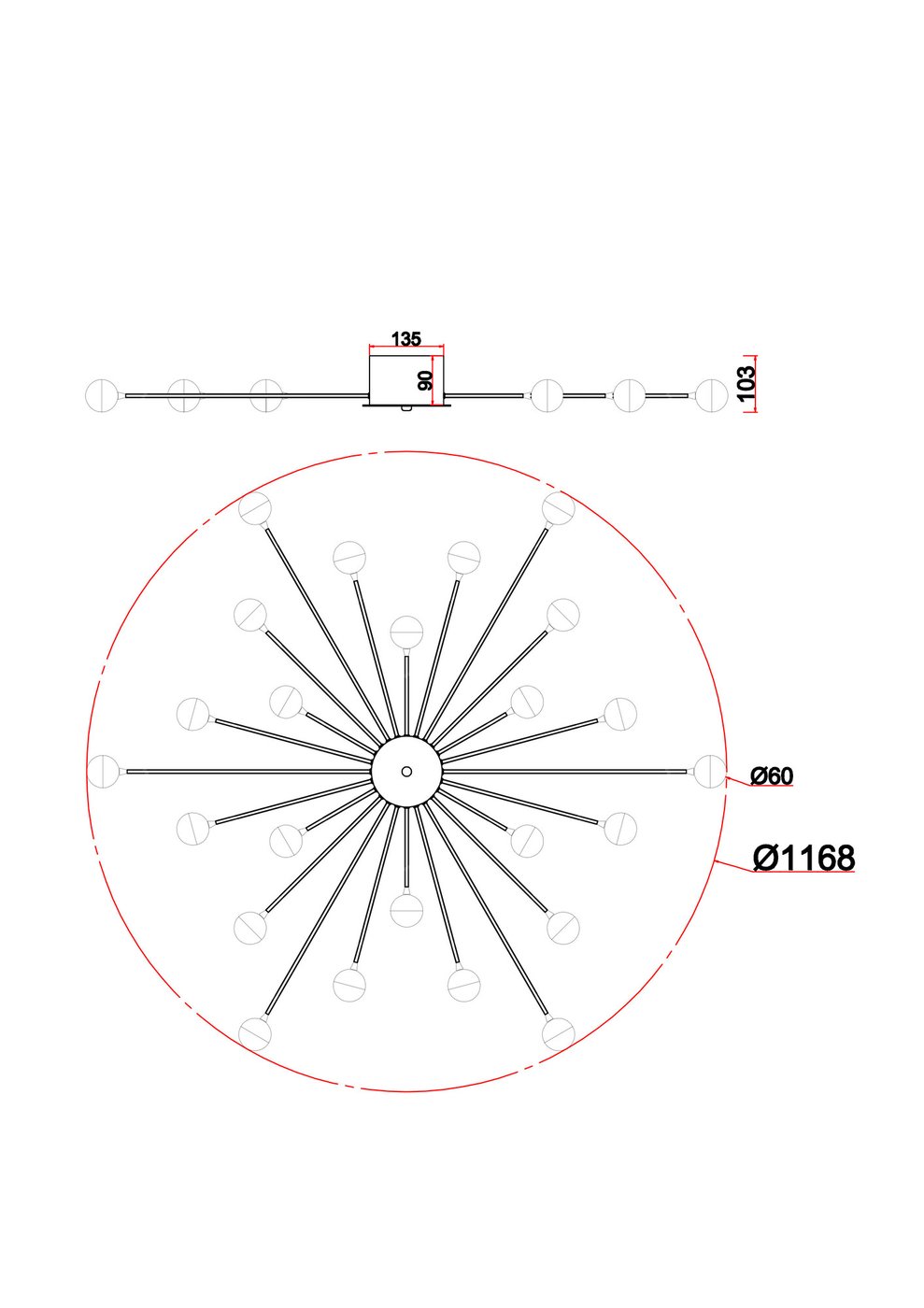 Потолочный светильник выполнен в виде радиальной композиции с тонкими металлическими лучами, на концах которых размещены небольшие сферические плафоны, поэтому свет распределяется по окружности и равномерно заполняет пространство. В серии Freya Celebrity такая схема работает как основной свет для помещений с невысокими потолками: компактная высота чаши 90 мм не опускает уровень, а множественные точки создают общую яркость без тяжёлого центрального пятна. При перемещении по комнате свет воспринимается мягко, поскольку часть плафонов выполнена из матового стекла, а часть — с прозрачным или акриловым покрытием с латунным напылением, что добавляет глубину бликов. Двадцать четыре источника с цоколем G4 позволяют равномерно распределить световой поток и снизить резкие тени на стенах и мебели. Суммарная мощность до 60 Вт даёт достаточную яркость для гостиной или спальни среднего размера при правильном подборе ламп по температуре. Чёрная арматура с латунными акцентами подчёркивает графику конструкции, а степень защиты IP20 рассчитана на сухие жилые помещения.