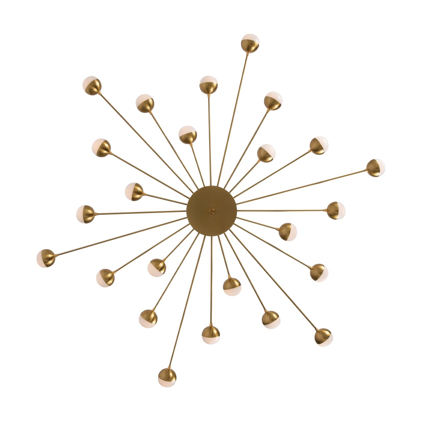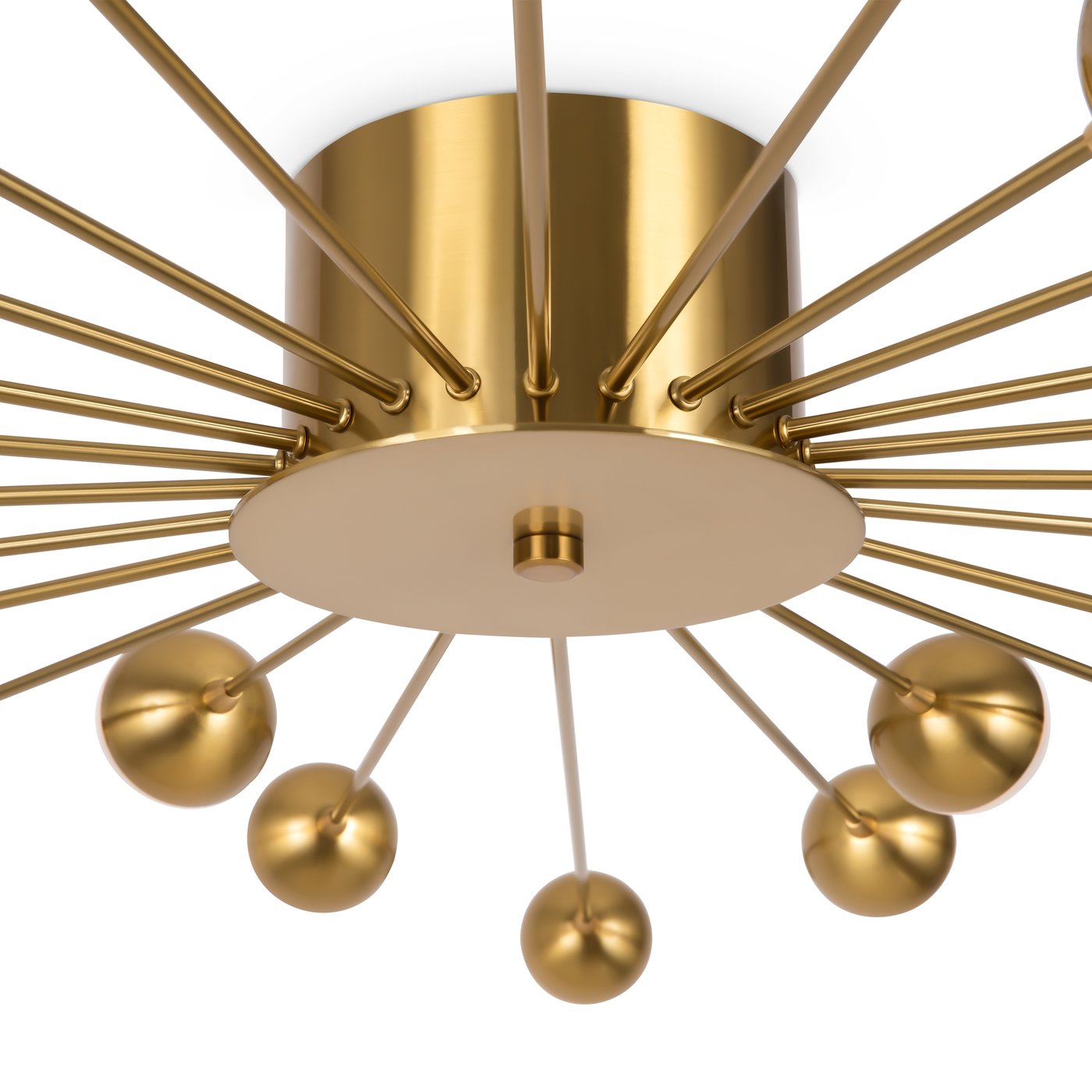 Потолочный светильник выполнен как плоская радиальная композиция на низком основании, где от центральной чаши расходятся тонкие лучи с множеством небольших сферических плафонов. В модели Freya из коллекции Celebrity плафоны частично матовые и частично с латунным покрытием, поэтому свет распределяется не только вниз, но и мягко отражается от металлизированных поверхностей, снижая контраст. Такой формат рассчитан на основной свет в комнате с невысоким потолком: светильник почти не «съедает» высоту, но перекрывает большую площадь. Когда человек перемещается по пространству, множество точек света делают тени от мебели менее резкими и поддерживают равномерную освещённость. Двадцать четыре лампы с цоколем G4 позволяют набрать нужную яркость за счёт суммарного потока, при этом каждая точка остаётся маломощной и комфортной для глаз. Сферы из акрила диаметром около 60 мм рассеивают свет и скрывают источник, поэтому при взгляде снизу нет прямой слепимости. Крепление на планку и степень защиты IP20 рассчитаны на сухие жилые помещения, а диаметр потолочной чаши 135 мм помогает аккуратно собрать проводку и узел крепления.