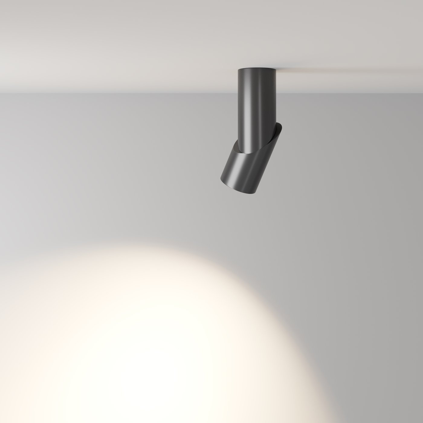 Накладной потолочный светильник с цилиндрическим основанием и поворотной головкой работает как управляемый источник направленного света. В коллекции Dafne от Maytoni модель выполнена из алюминия в чёрном цвете и крепится непосредственно к потолку без врезки, что удобно при бетонном основании или уже готовой отделке. Поворот до 340° позволяет развернуть модуль и направить луч на картину, зону чтения или рабочую поверхность: при лёгком движении руки свет смещается и формирует чёткое световое пятно. Узкий угол 38° создаёт концентрированный акцентный свет без лишней засветки окружающего пространства. Световой поток 1000 лм при мощности 10 Вт обеспечивает достаточную яркость для выделения объекта, а температура 4000 К сохраняет нейтральную цветовую среду. Индекс цветопередачи Ra 90 помогает корректно передавать оттенки материалов, что важно для жилых и коммерческих интерьеров, а степень защиты IP20 рассчитана на использование в сухих помещениях.