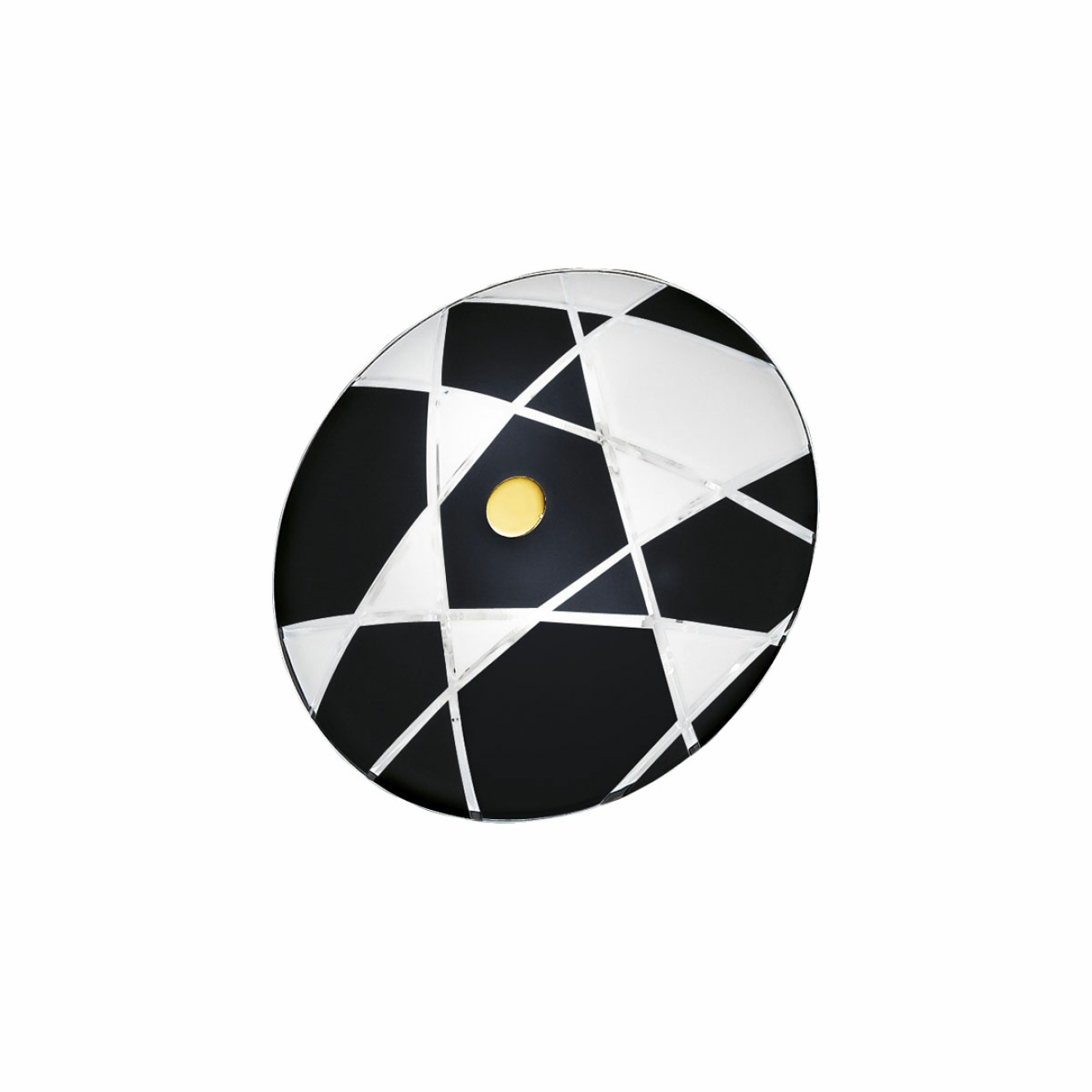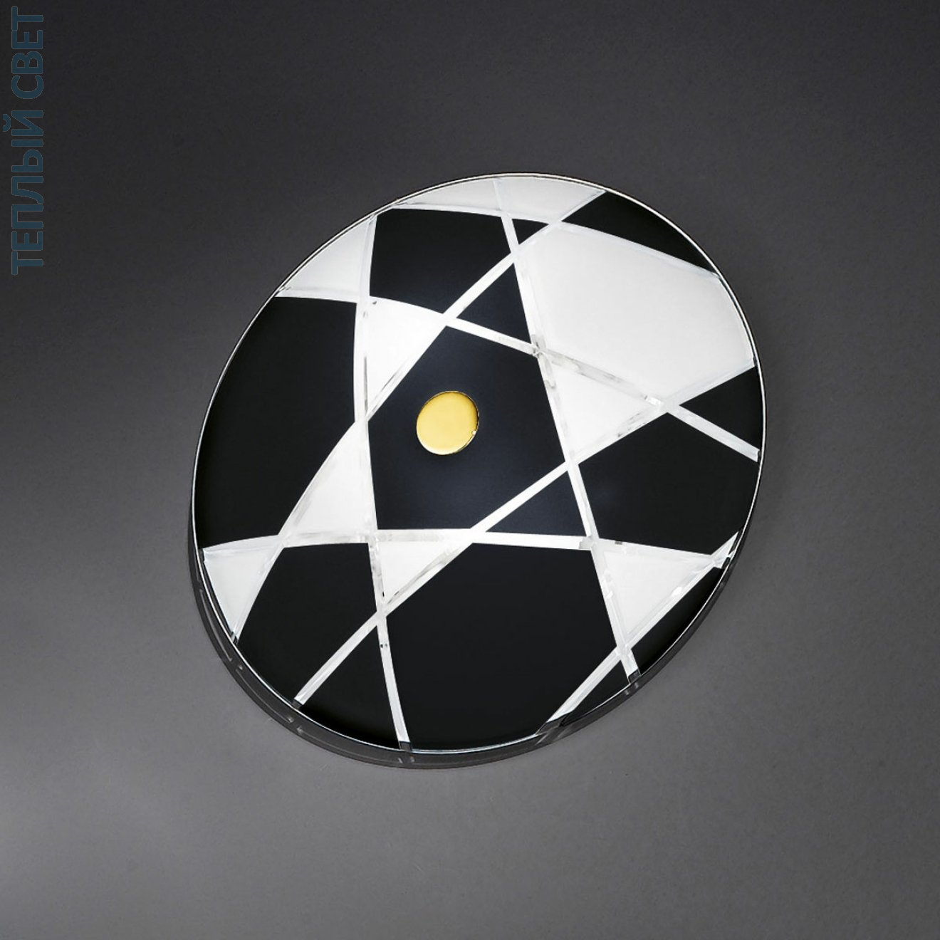 Потолочный накладной светильник круглой формы предназначен для общего освещения и устанавливается вплотную к потолку. Конструкция включает стеклянный плафон диаметром около 32 см и высотой до 7 см, внутри которого размещены два источника света с цоколем E14. Плафон выполнен из декоративного стекла с геометрическим рисунком из чёрных и светлых сегментов, дополненных центральным элементом с отделкой под золото 24 карата, что влияет на характер прохождения света через поверхность. Основание служит для крепления конструкции. Свет распределяется через всю площадь плафона, формируя рассеянное освещение с выраженным графическим рисунком.