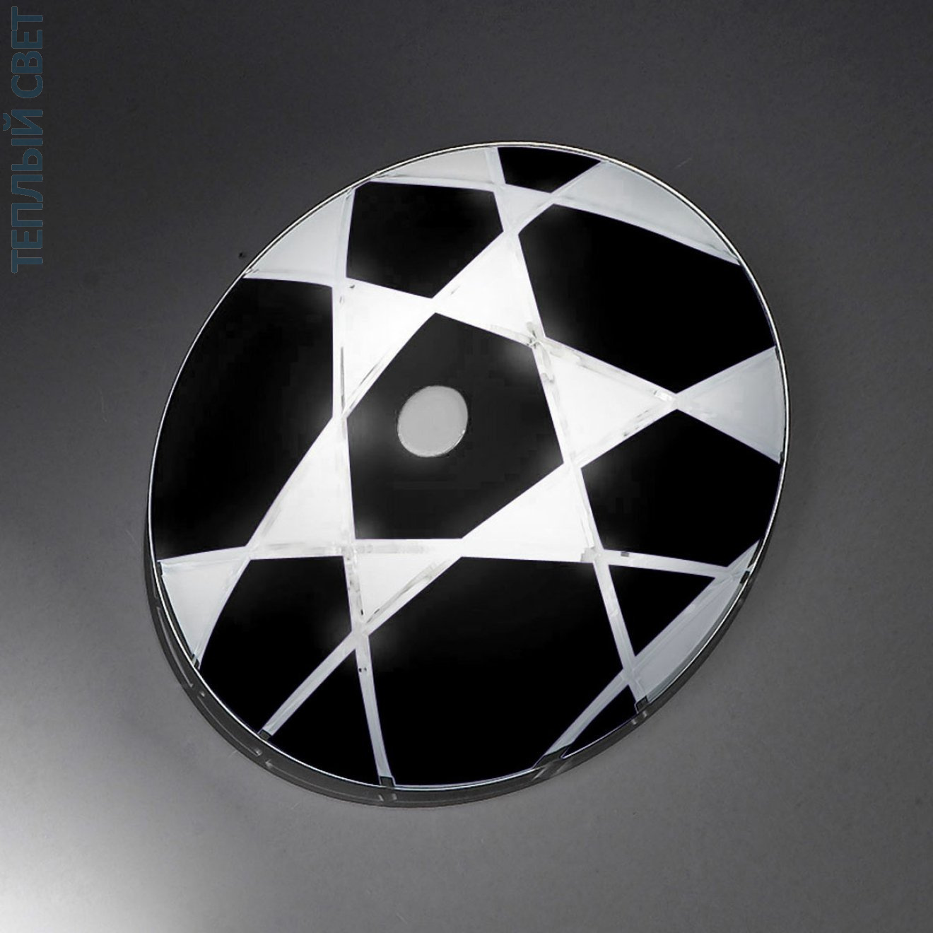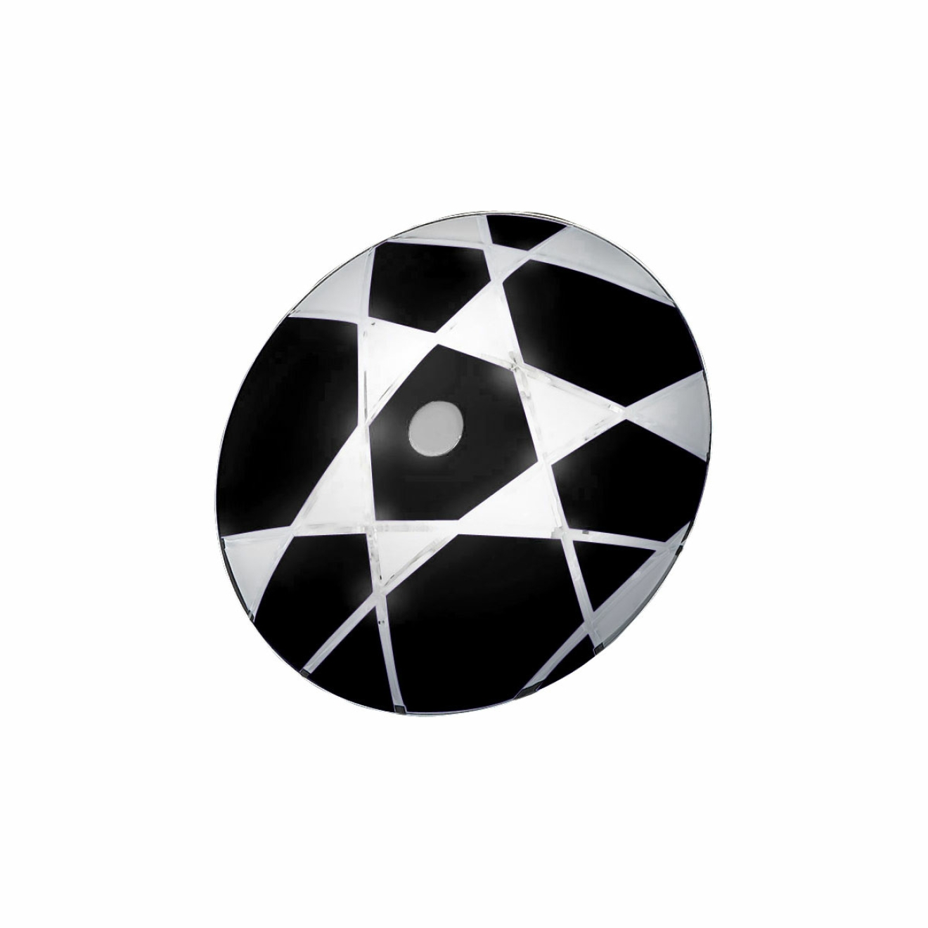 Потолочный накладной светильник круглой формы предназначен для общего освещения и устанавливается вплотную к потолку. Конструкция включает стеклянный плафон диаметром около 32 см и высотой до 7 см, внутри которого размещены два источника света с цоколем E14. Плафон выполнен из декоративного стекла с геометрическим рисунком из чёрных и светлых сегментов, собранных в мозаичную композицию, что влияет на характер прохождения света через поверхность. Основание имеет хромированную отделку и служит для крепления конструкции. Свет распределяется через всю площадь плафона, формируя рассеянное освещение с выраженным графическим рисунком.