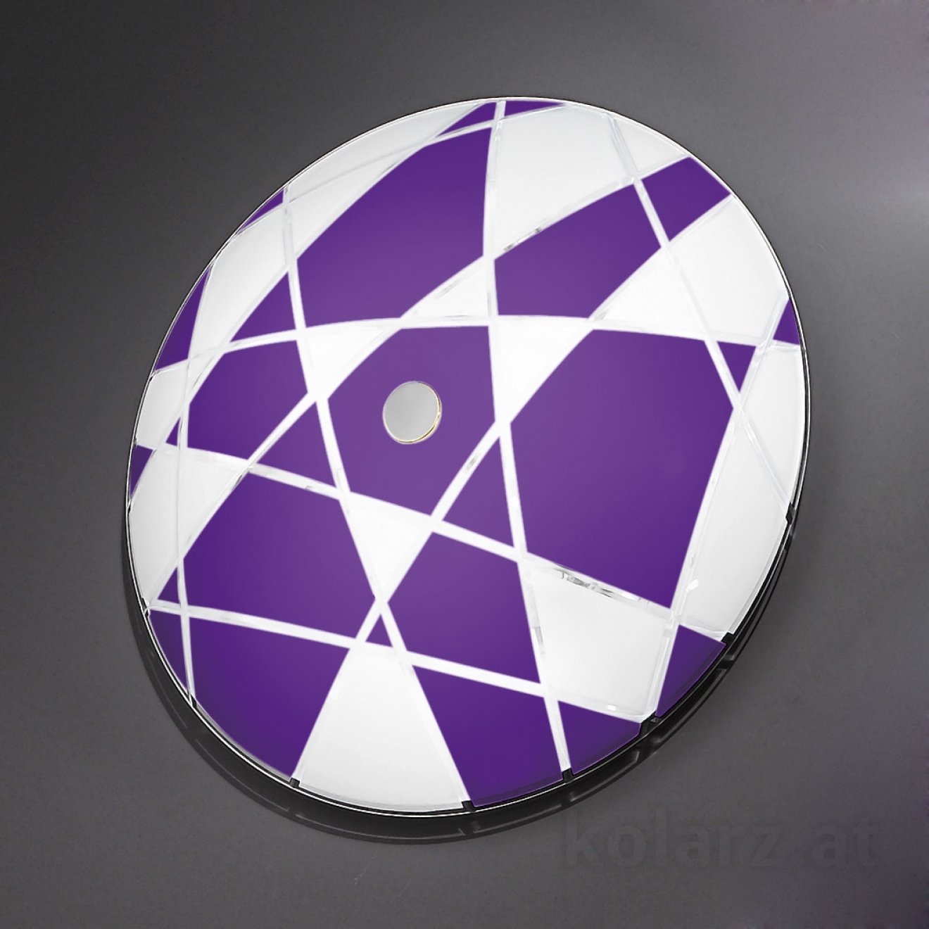 Потолочный накладной светильник с круглым корпусом высотой около 7 см, подходит для общего освещения в помещениях с невысокими потолками. Диаметр 42 см, внутри размещены три лампы с цоколем E27, что даёт возможность регулировать яркость за счёт выбора источников света. Рассеиватель выполнен из стекла с геометрическим рисунком в фиолетово-белом исполнении, который закрывает лампы и равномерно распределяет свет по всей площади. Центральный элемент крепления выделен отделкой под золото 24 карата. Конструкция устанавливается вплотную к потолку и закрывает монтажную зону, сохраняя компактный профиль без выступающих деталей.