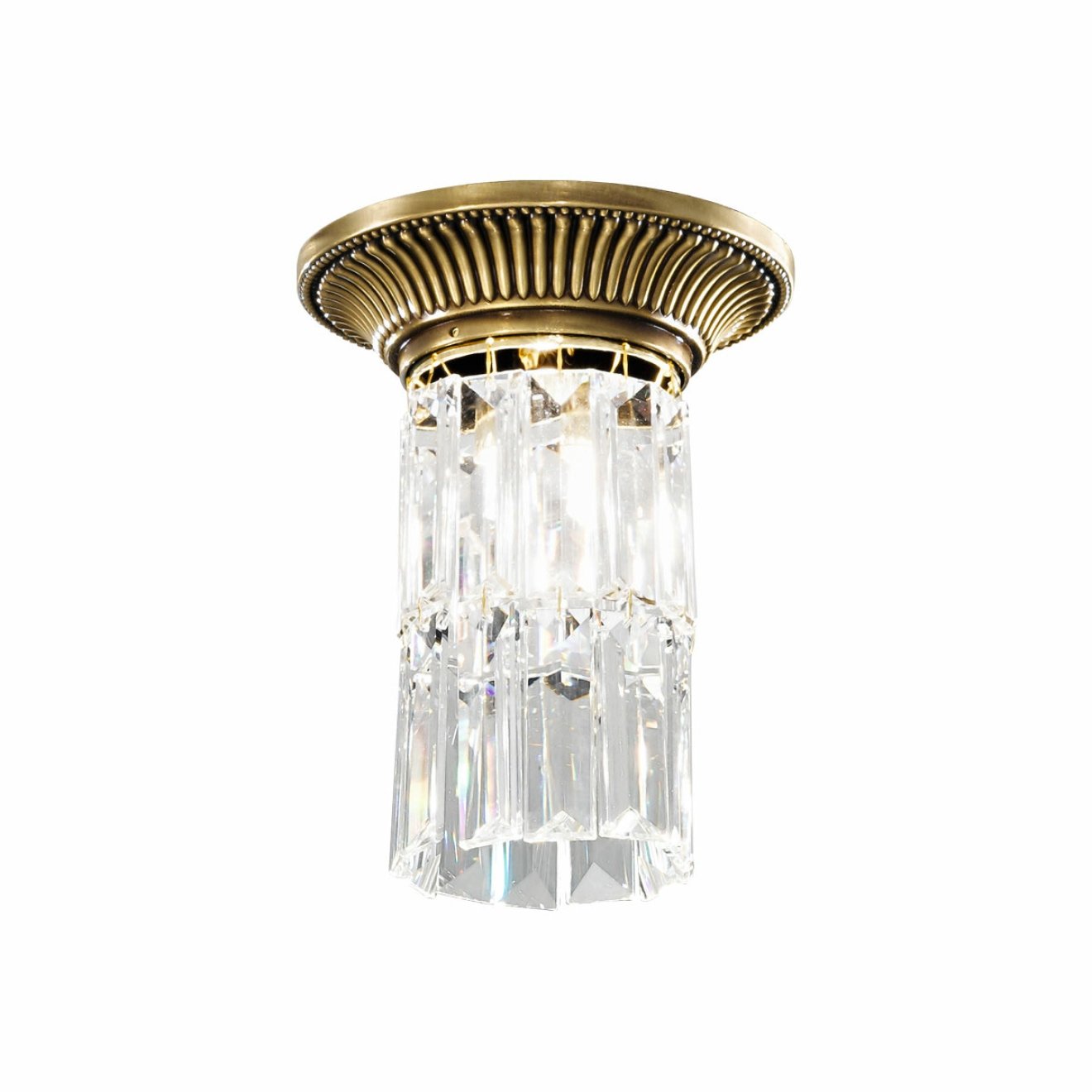 Потолочный светильник рассчитан на одну лампу с цоколем G9 и предназначен для установки на ровную поверхность потолка. Корпус выполнен из состаренной латуни, диаметром 16 см и высотой 20 см, что определяет его компактный профиль. Основным элементом конструкции является цилиндрическая подвеска из прозрачных кристаллов, закреплённых под металлическим основанием, обеспечивающая декоративное преломление света. Видны рифлёные детали на металлической части, которые подчёркивают текстуру материала. Светильник отличается направленным вниз светом и сочетанием металла с кристаллами, что важно учитывать при выборе для интерьера.