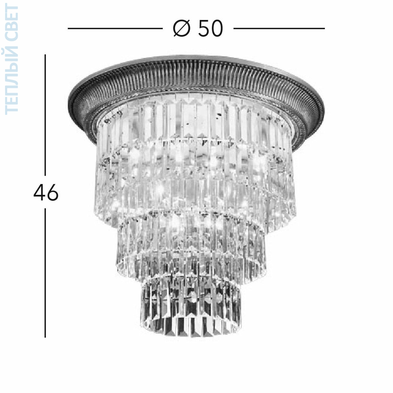 Потолочный светильник Kolarz из серии Milord Crystal предназначен для накладного монтажа и сочетает центральный и дополнительный источники света с цоколями E27 и E14. Конструкция включает круглое основание диаметром около 50 см с покрытием под золото 24 карата и каскад прозрачных стеклянных подвесок, сформированных в ступенчатую цилиндрическую композицию высотой около 46 см. Многослойные вертикальные ряды стеклянных элементов полностью закрывают лампы и образуют плотную светорассеивающую поверхность, направленную вниз. Такое устройство формирует выраженный объём светильника при компактном креплении к потолку.