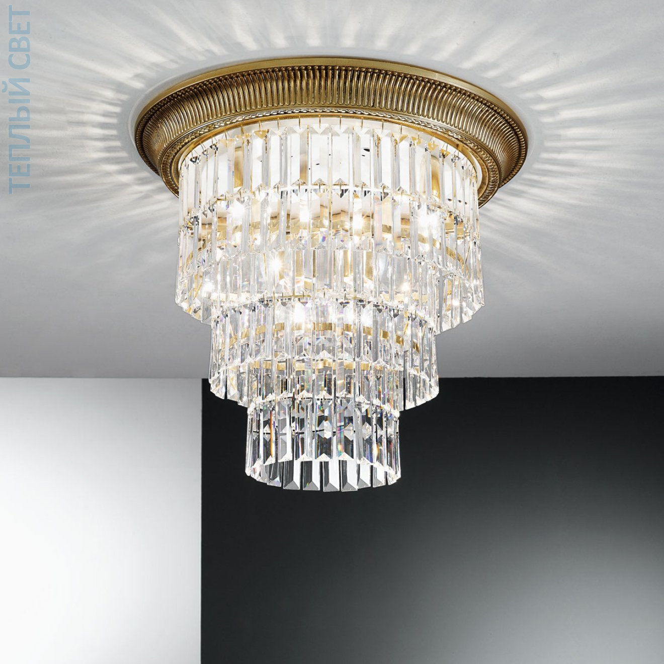 Потолочный светильник Kolarz из серии Milord Crystal предназначен для накладного монтажа и формирует многоуровневое освещение за счёт комбинации источников света с цоколями E27 и E14. Конструкция включает круглое основание диаметром около 50 см с отделкой под состаренную латунь и каскад подвесок из прозрачного стекла, собранных в ступенчатую цилиндрическую форму высотой около 46 см. Вертикальные ряды стеклянных элементов закрывают лампы и образуют плотную светорассеивающую структуру, направленную вниз. Такое решение создаёт выраженный объём при компактном потолочном креплении и определяет характер светораспределения.
