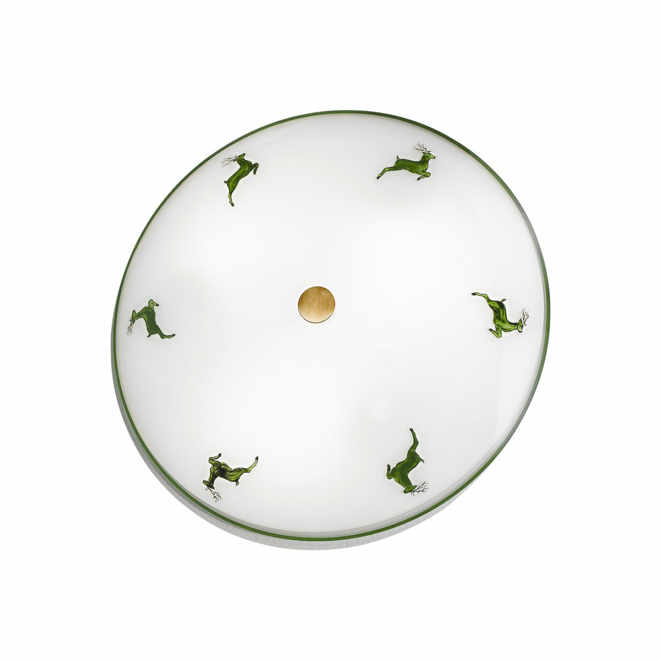Потолочный светильник круглой формы с плоским стеклянным плафоном, рассчитанный на установку вплотную к поверхности потолка. Диаметр составляет 400 мм при высоте всего 70 мм, что делает модель компактной по вылету и подходящей для помещений с ограниченной высотой. Плафон выполнен из матового стекла с декоративным рисунком в виде повторяющихся зелёных фигур по окружности и тонкой окантовкой по краю, в центре расположен крепёжный элемент из состаренной латуни. Внутри предусмотрено три лампы с цоколем E27, что позволяет распределить свет по всей площади плафона. Конструкция ориентирована на равномерное верхнее освещение в жилых интерьерах.