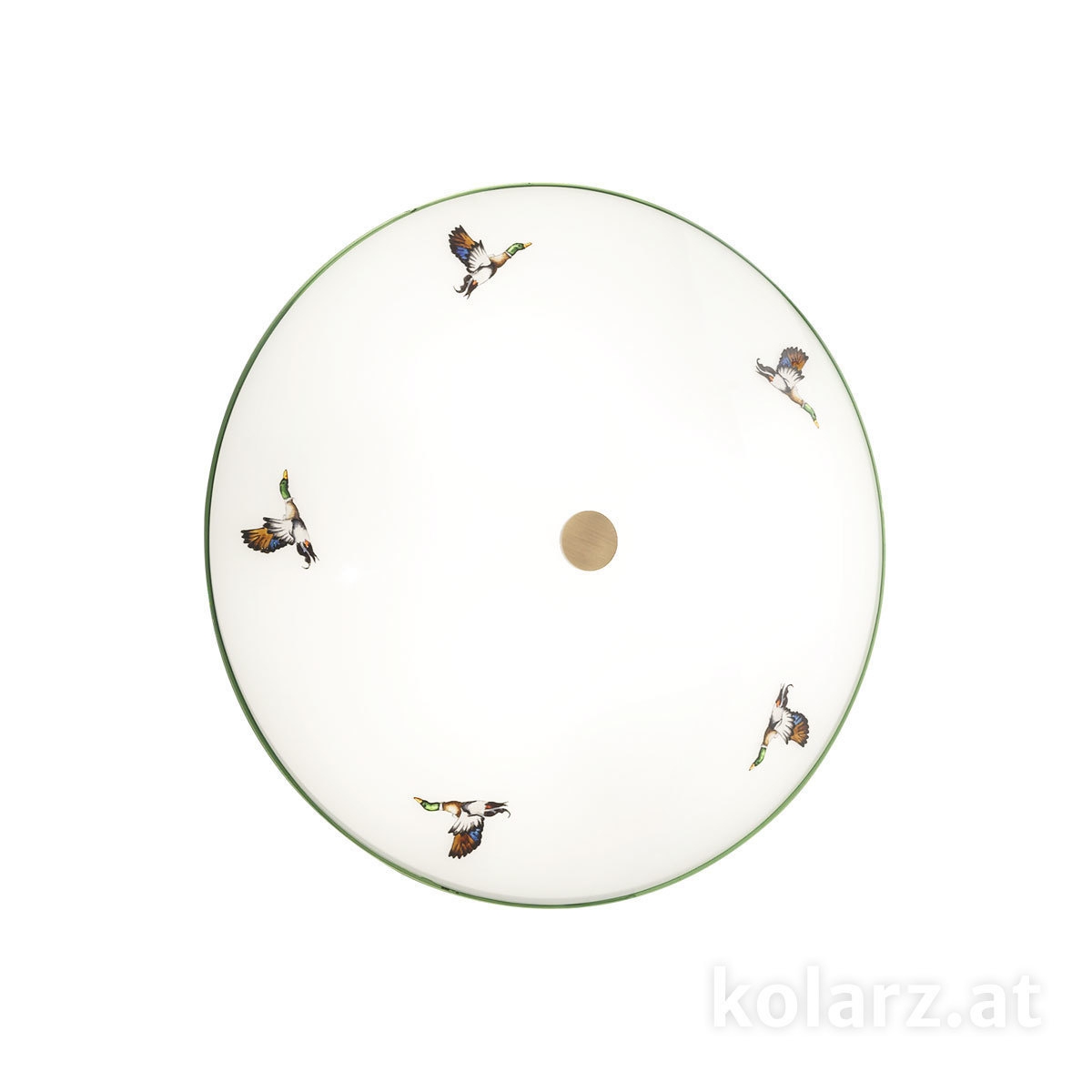 Потолочный накладной светильник круглой формы рассчитан на три лампы с цоколем E27 и предназначен для общего освещения помещений. Конструкция представляет собой плоский диск диаметром 42 см и высотой 7 см с центральным крепёжным элементом в отделке состаренной латуни и декоративной окантовкой по краю. Основная поверхность светорассеивателя выполнена в светлом тоне и дополнена равномерно распределённым декоративным рисунком, который остаётся видимым при выключенном состоянии. Небольшая высота корпуса позволяет использовать светильник в помещениях с ограниченной высотой потолка, при этом три источника света обеспечивают достаточное покрытие по площади.