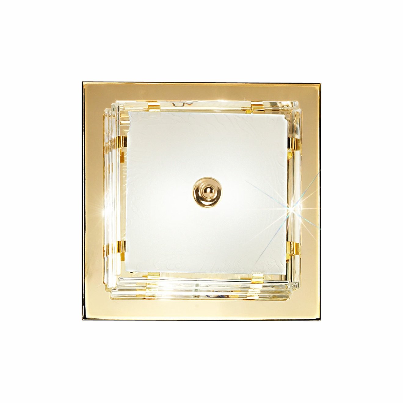 Потолочный светильник Kolarz Ontario имеет квадратную форму 31 × 31 см и высоту 10 см, рассчитан на две лампы с цоколем E27. Конструкция состоит из квадратного основания с отделкой золото 24 карата, центрального матового рассеивателя и прозрачной стеклянной рамки по периметру, через которую видны световые блики от источников внутри корпуса. На фото применения модель установлена на стене, но в названии и параметрах она указана как потолочный светильник, поэтому её можно рассматривать как накладной светильник для плоскости потолка или стены. Чертёж подтверждает компактную квадратную геометрию и небольшой вынос от поверхности.