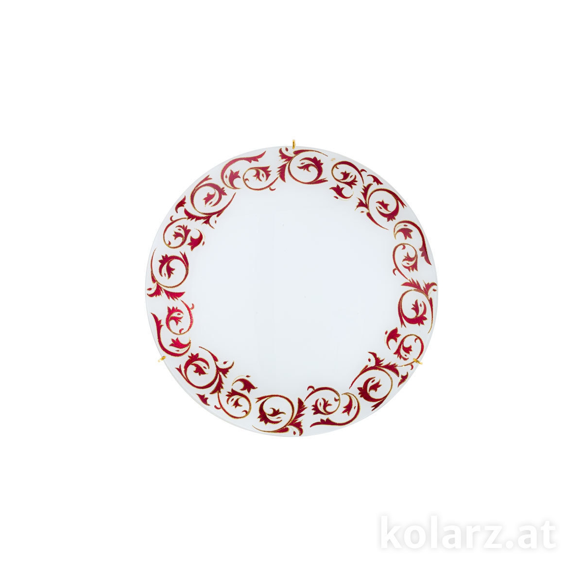 Потолочный светильник круглой формы диаметром 300 мм предназначен для общего освещения и устанавливается накладным способом с вылетом около 80 мм. Конструкция представляет собой закрытый плафон с матовой центральной частью и декоративным ободом по краю, оформленным орнаментом в красно-белой гамме с элементами золота. Внутри размещены две лампы с цоколем E27, что позволяет получить равномерное освещение через рассеиватель без прямой видимости источников. Компактная высота и сплошной плафон делают модель подходящей для помещений с невысокими потолками, где требуется широкий заливной свет без подвесных элементов.