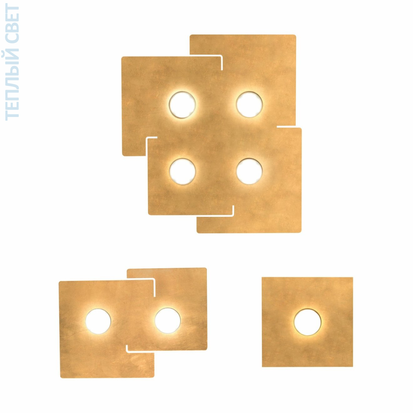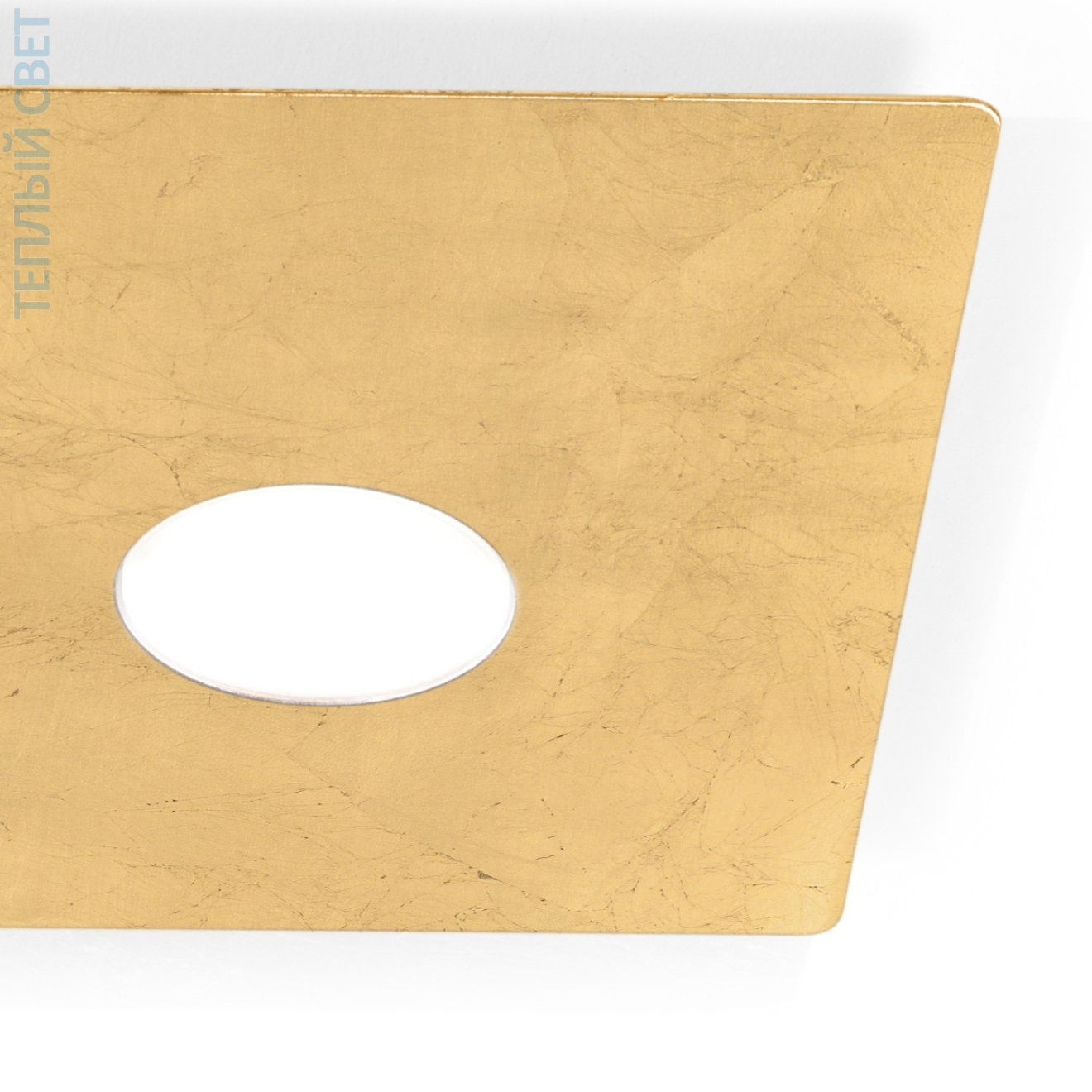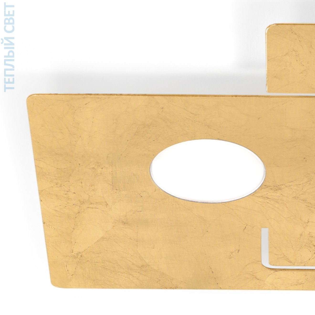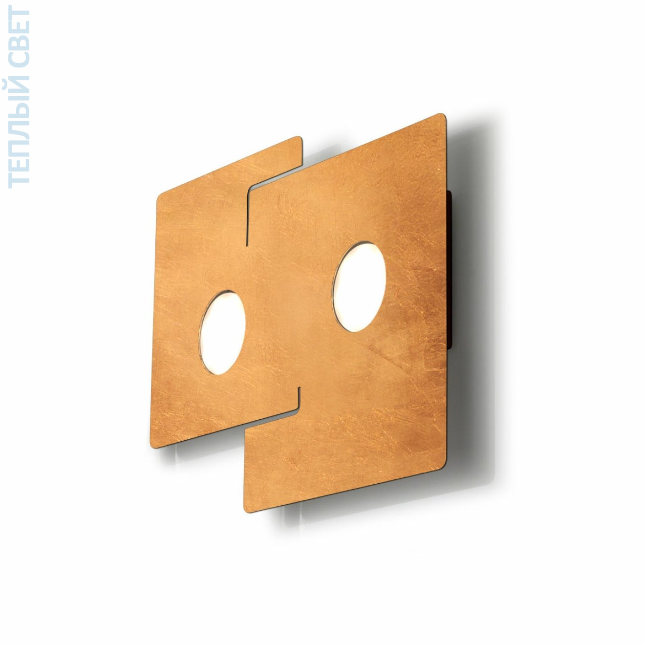 Потолочный светильник с накладной установкой выполнен в виде пересекающихся квадратных пластин с отделкой под золотой лист, на которых размещены круглые посадочные места под лампы GX53. Конструкция плоская, высота всего 3 см, что делает его пригодным для помещений с невысокими потолками. Размеры 32×44 см задают вытянутую прямоугольную композицию из смещённых квадратов, за счёт чего свет распределяется через два встроенных источника света. Основа жёсткая, с видимыми крепёжными элементами между уровнями пластин, что формирует многослойную геометрию. Предназначен для установки в жилых и общественных интерьерах, где важна компактная высота и направленное потолочное освещение.