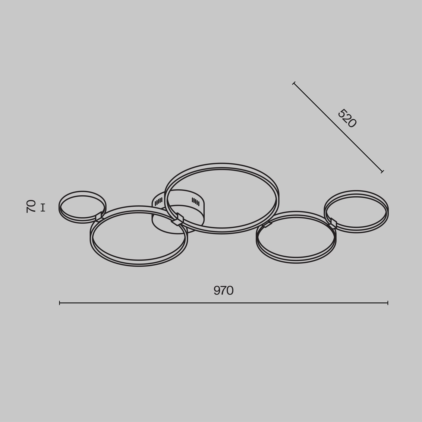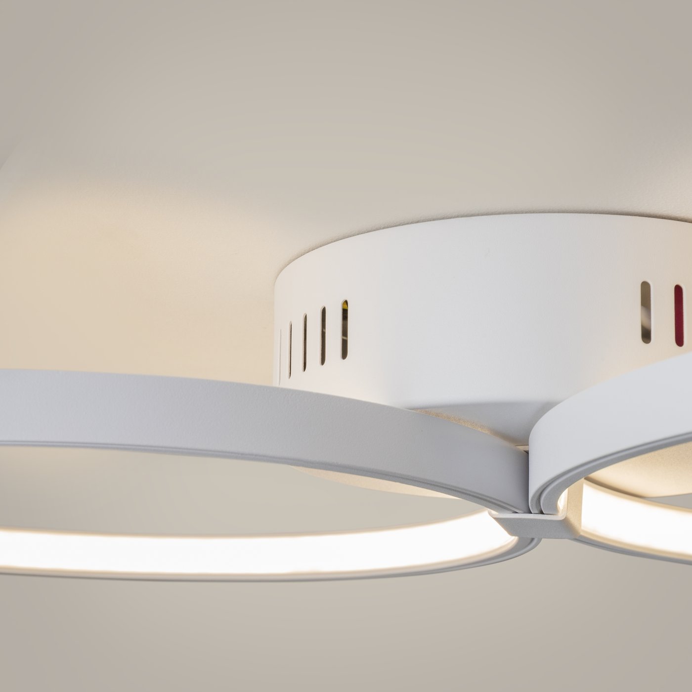 Потолочный светильник собран из нескольких тонких световых колец разного диаметра, которые закреплены на общей базе в асимметричной композиции и дают равномерное свечение по периметру. В модели Maytoni из коллекции Olympia светодиодные источники скрыты под опаловым рассеивателем, поэтому свет получается мягким и без точечных бликов даже при взгляде снизу. Такой формат рассчитан на основной свет в жилой комнате: когда человек перемещается по пространству, кольца распределяют поток по широкой площади и уменьшают резкие тени от мебели. Высота всего 70 мм позволяет использовать светильник на стандартных потолках, не создавая ощущения нависающей конструкции. Световой поток 3600 лм при мощности 43 Вт даёт уровень яркости, достаточный для гостиной или кухни-гостиной среднего размера, особенно если нужно перекрыть несколько зон одним источником. Угол рассеивания 360° помогает заполнить светом и центр, и периферию помещения, а индекс цветопередачи Ra 80 подходит для повседневного освещения без требований к максимально точной передаче оттенков. Крепление на планку и степень защиты IP20 рассчитаны на сухие помещения, а силиконовый рассеиватель дополнительно сглаживает свет и снижает контраст в вечернем сценарии.