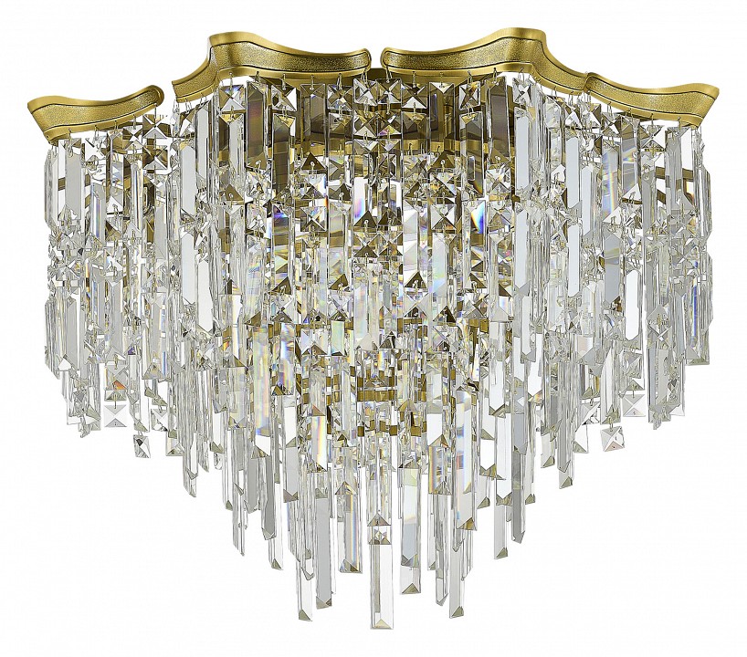 Потолочный светильник диаметром 520 мм выполнен в виде каскадной композиции из прозрачных хрустальных подвесок, собранных под волнообразным латунным основанием. В серии ST-Luce Ofelia верхняя металлическая рамка направляет свет внутрь массива кристаллов, поэтому поток проходит через огранённые элементы и формирует плотный основной свет с глубокой игрой бликов. Когда человек перемещается по гостиной, подвески разной длины по-разному преломляют лучи, и освещение остаётся объёмным без резкого ослепления. Семь ламп с цоколем E14 мощностью до 60 Вт каждая обеспечивают суммарно до 420 Вт, что позволяет освещать помещение площадью около 25–30 м² при грамотном подборе источников. Высота 350 мм делает модель уместной при стандартных потолках, сохраняя выразительный каскадный силуэт. Возможность диммирования помогает регулировать яркость в зависимости от времени суток и выбранного сценария.