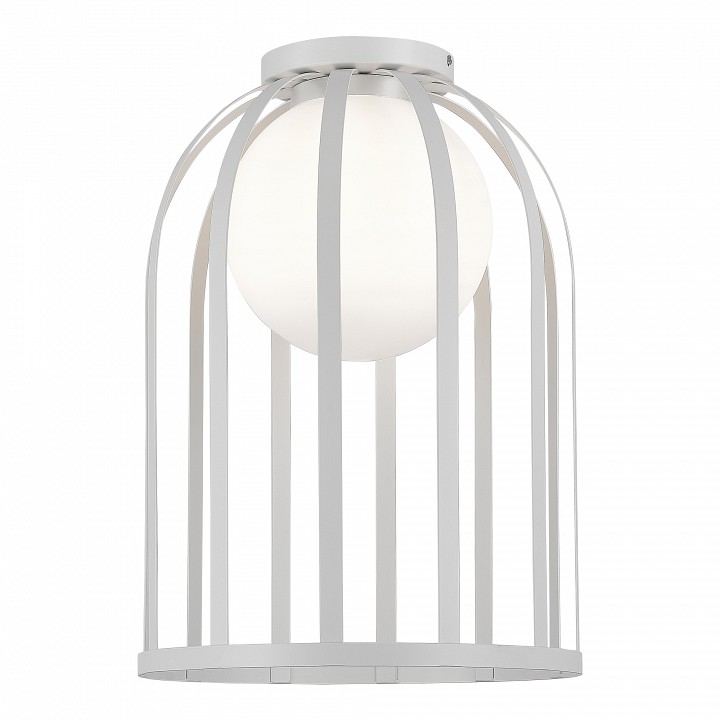 потолочный светильник с белым металлическим каркасом и шаровым плафоном