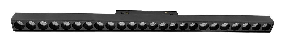 Линейный светильник для магнитного трека предназначен для установки в однофазной системе и используется для направленного освещения рабочих и общественных пространств. Корпус вытянутой прямоугольной формы длиной 436 мм выполнен из полимера и оснащён рядом светодиодных источников, ориентированных вниз, что формирует равномерную линию света по всей длине. Модель работает от напряжения 48 В, мощность составляет 24 Вт при световом потоке 1630 лм и цветовой температуре 4000 К. Крепление осуществляется непосредственно на магнитный трек, что позволяет перемещать и фиксировать светильник без дополнительного монтажа. Степень защиты IP20, поверхность корпуса матовая чёрная.