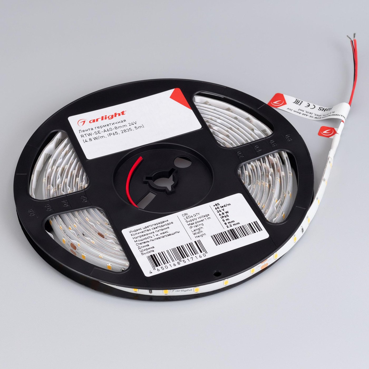 Светодиодная герметичная лента RTW серии A60 со степенью защиты IP65. Напряжение питания 24 В, мощность 4.8 Вт/м, ширина 8 мм. Светодиоды SMD 2835, 60 шт/м, дневного цвета свечения (4000K). Минимальный отрезок 100 мм (6 светодиодов). Индекс цветопередачи CRI>85. Применяется для декоративной подсветки любых жилых, коммерческих помещений, декоративной подсветки интерьеров, потолочных ниш, рабочих зон кухни, влажных зон, мебели, рекламных конструкций и витрин.