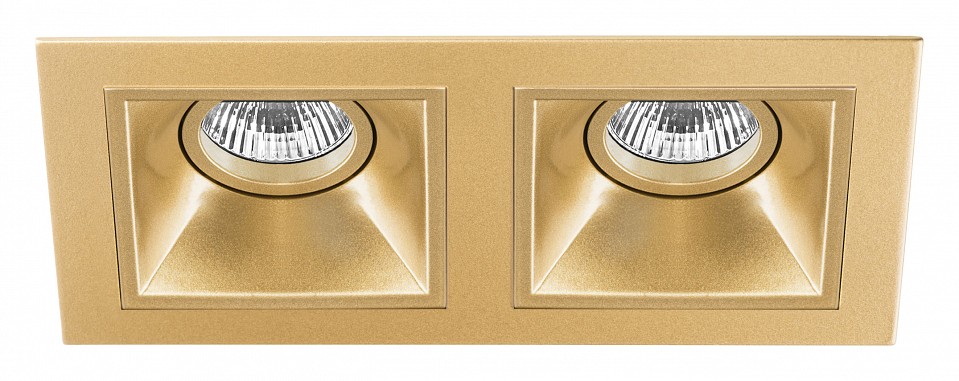 Точечный потолочный светильник предназначен для скрытой установки с креплением на прижимных скобах и рассчитан на использование двух ламп GU5.3 галогенового или светодиодного типа мощностью до 50 Вт каждая. Корпус выполнен из металла с глянцевой золотой отделкой и представляет собой прямоугольную рамку с двумя встроенными полусферическими рефлекторными плафонами. Размеры светильника 215×115×87 мм, глубина установки 85 мм, рабочий диапазон температур от +1 до +35 °C, степень защиты IP20. Светильник ориентирован на потолочные монтажи в жилых и рабочих помещениях, обеспечивает направленное освещение с возможностью диммирования.