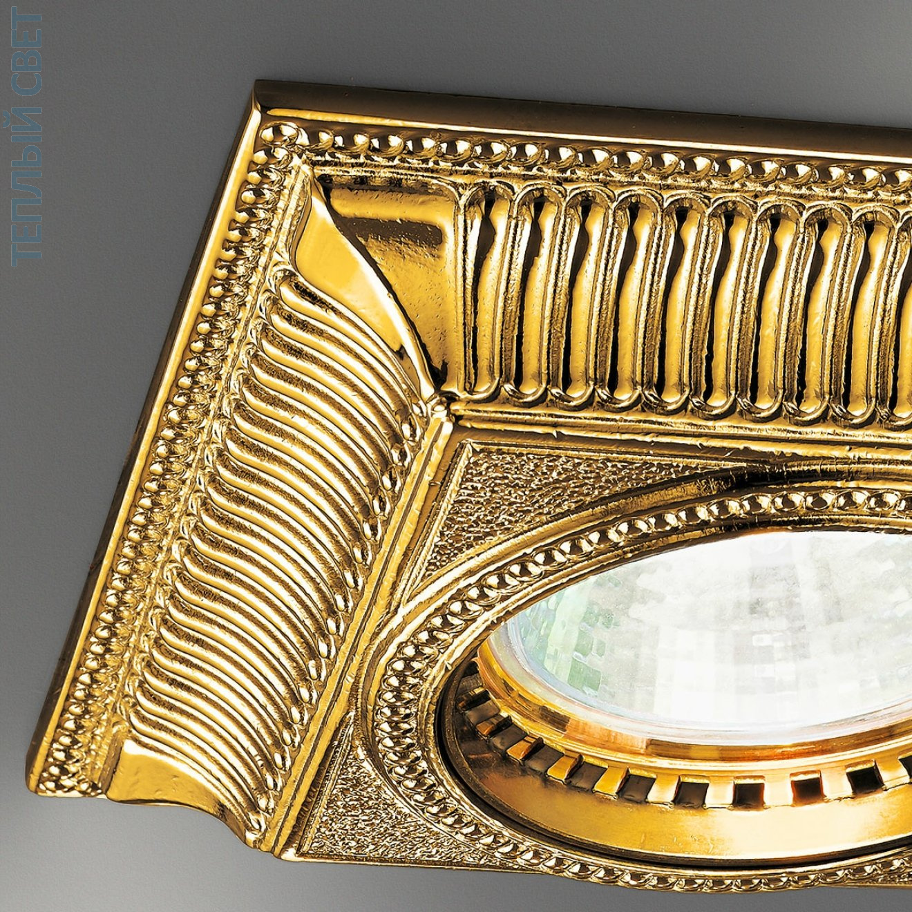 встраиваемый потолочный светильник с квадратной рамкой золотого цвета