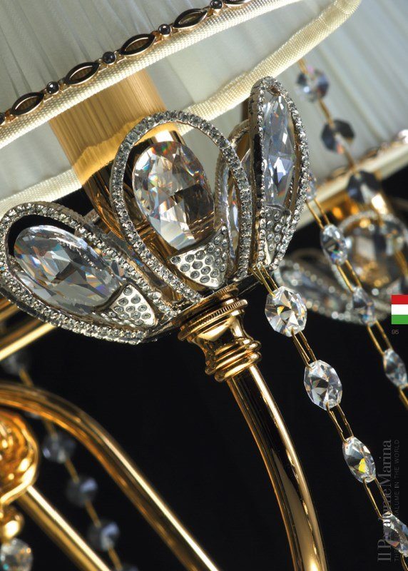 Напольный светильник на 5 ламп из литой латуни ORO 24 карата с хрустальными плафонами и двухслойными абажурами. Этот светильник эффектно рассеивает свет, создавая теплую и уютную атмосферу.