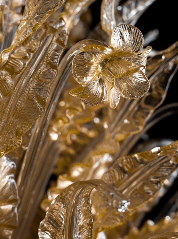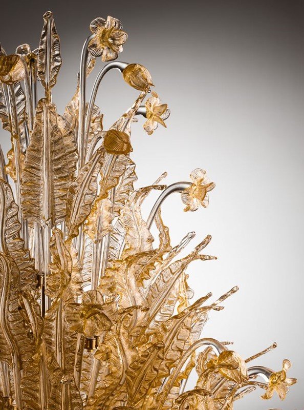 Напольный светильник II Paralume Marina из коллекции Marina представляет собой роскошный торшер с декоративной чашей и стеклянными элементами в виде листьев. Высотой 165 мм и диаметром 136 мм, он оснащён 21 лампой с цоколем G9 (в комплект не входят лампы), создавая мягкое и рассеянное освещение. Латунная арматура, покрытая 24-каратным золотом, в сочетании с прозрачным муранским стеклом, украшенным золотыми вставками, придаёт светильнику изысканный и элегантный вид. Этот светильник станет центральным элементом интерьера, создавая тёплую и уютную атмосферу в гостиной или прихожей, и идеально подойдёт для больших помещений.