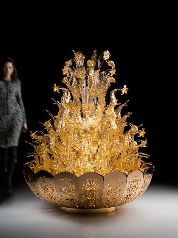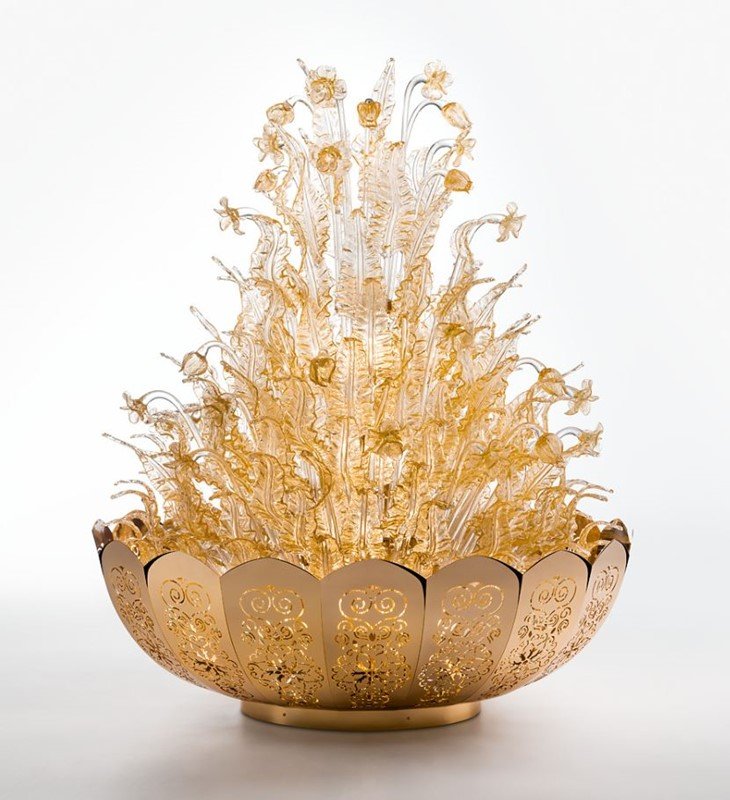 Эффектный гигантский торшер, подходящий для прихожей или центральной комнаты, с перфорированной металлической чашей, покрытой 24-каратным золотом, и выдувным муранским стеклом с отделкой из 24-каратного золота. Этот светильник эффектно рассеивает свет, создавая теплую и уютную атмосферу.