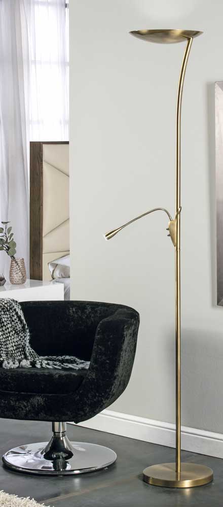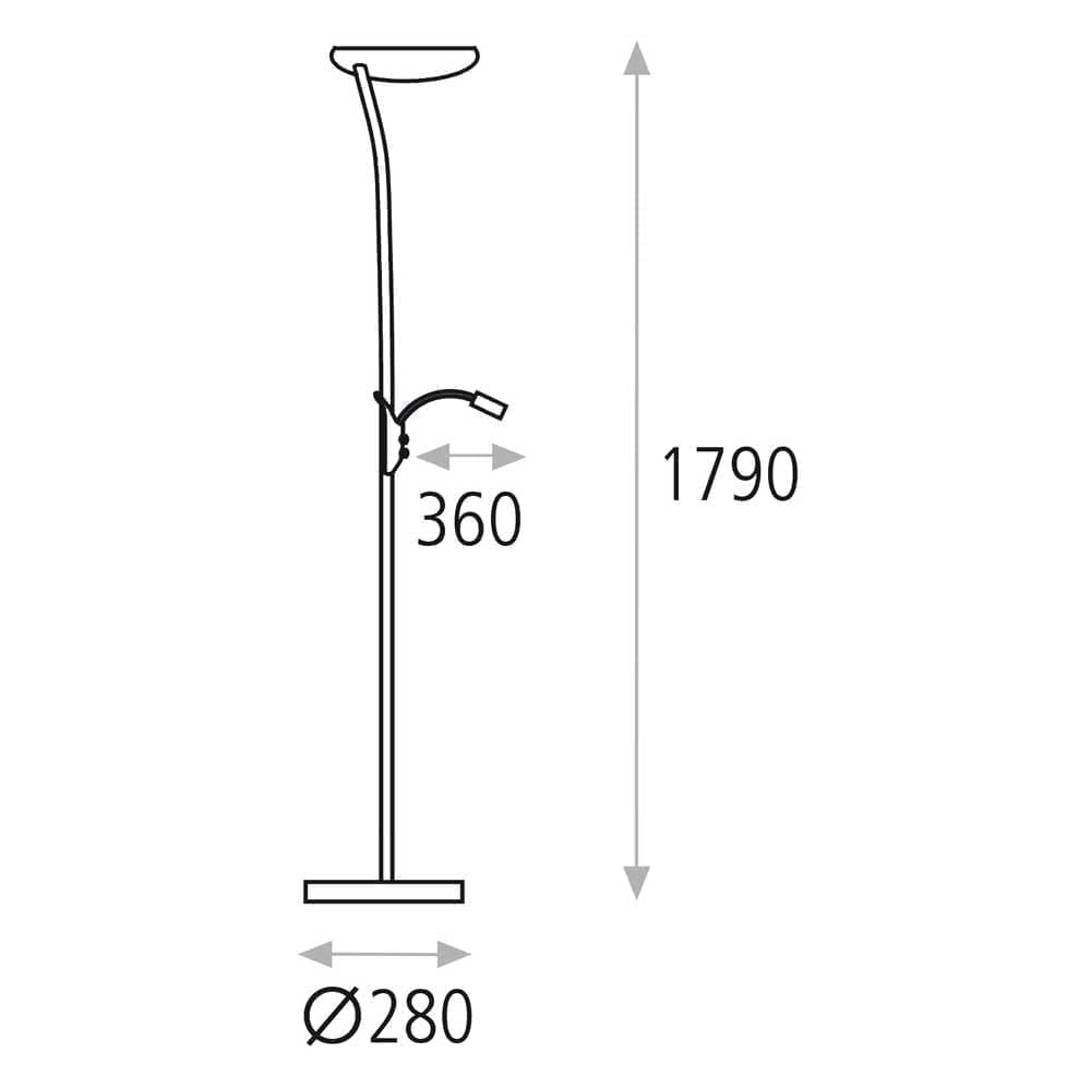Напольный торшер предназначен для общего и локального освещения в интерьере. Он состоит из круглого металлического основания и вертикальной стойки с двумя встроенными светодиодными источниками: основным LED 24 Вт 3000 K с потоком 2950 лм и дополнительным LED 3 Вт 3000 K 350 лм, который можно использовать как направленный свет для чтения. Корпус выполнен в сатинированном никеле, включающий регулируемую головку и гибкий кронштейн для поворота лампы на 360°. Диаметр основания 280 мм, высота торшера 1790 мм, что позволяет оценить масштаб в комнате и расстояние до рабочей зоны. Управление яркостью встроенного света осуществляется с помощью встроенного диммера.